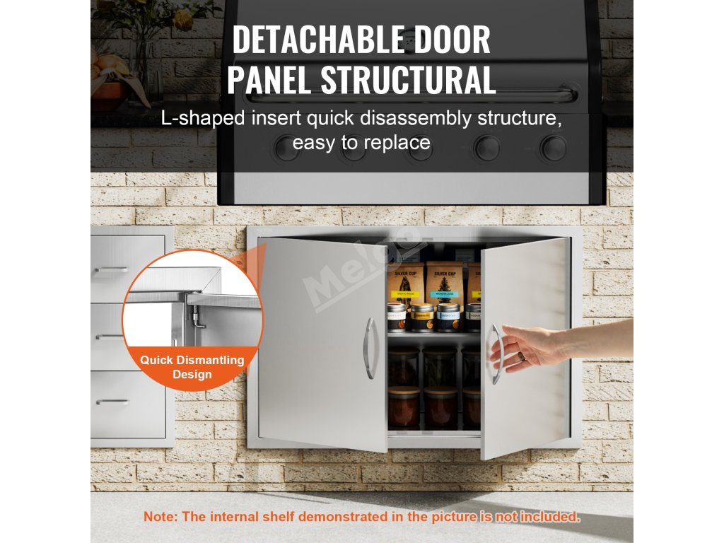 Dvířka venkovní kuchyně jsou vybavena ergonomickou rukojetí pro snadné otevírání. Hrany rámu dvířek jsou ohnuté a zesílené. Odnímatelná konstrukce dvířek umožňující vyjmutí závěsu, a tím změnu směru otevírání dvířek. Směr můžete nastavit podle svých zvyklostí při používání.