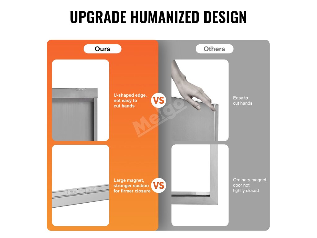 Tato přístupová dvířka ke grilu jsou vyrobena z robustní konstrukce z vysoce kvalitní nerezové oceli, odolné proti korozi, vodě a poškrábání, snadno se čistí a nezanechávají stopy ani skvrny. Zcela bezešvá konstrukce, žádné ostré rohy, což zajišťuje bezpečnost uživatele.