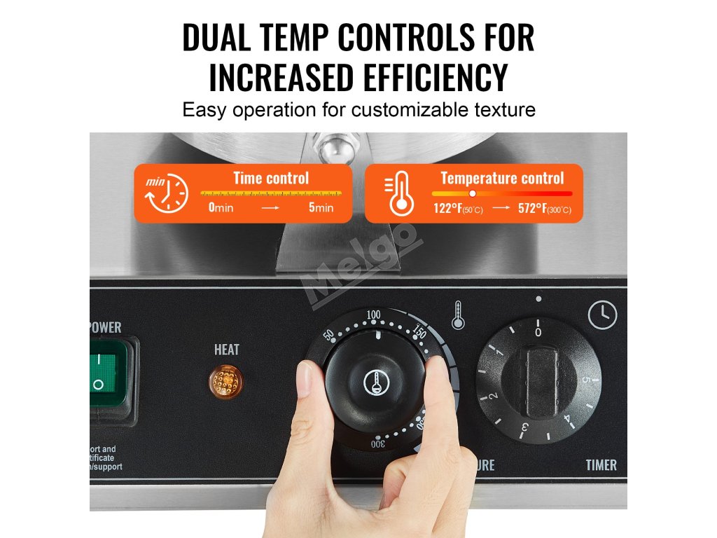 Je vybaven přesným časovačem a knoflíkem pro nastavení teploty, které jsou zřetelně označeny. Když je vafle připravena, vydá jasný zvukový signál. Vaflovač využívá uzavřenou technologii ohřevu, která zajišťuje rovnoměrný ohřev na obou stranách, rychlé tvarování a snadnou výrobu chutných vaflí.