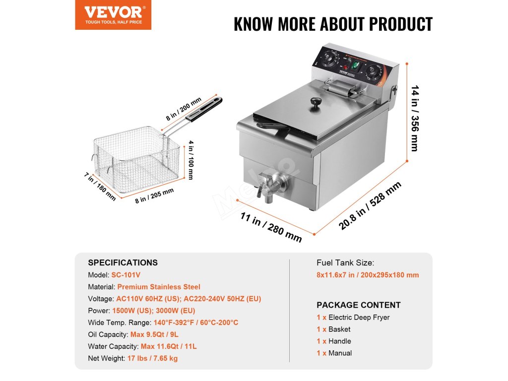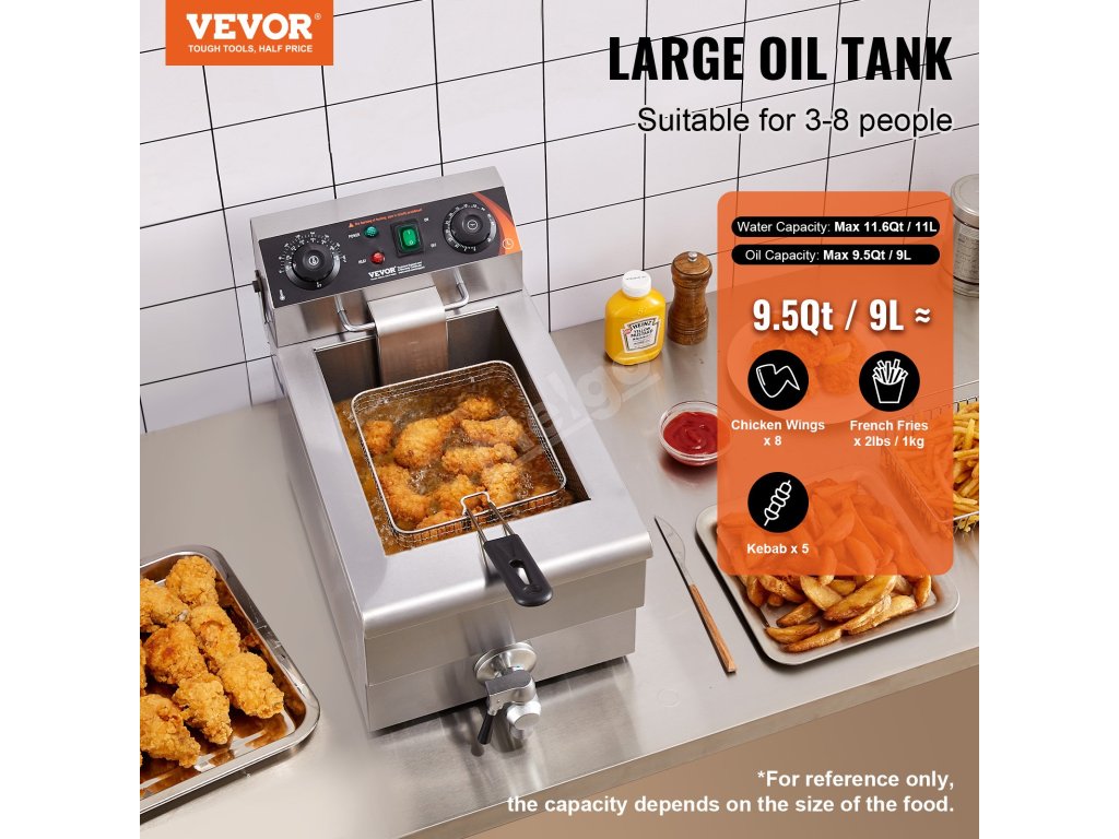 Tato komerční elektrická fritéza umožňuje fritovat různé druhy potravin. Kapacita oleje: Max. 9 l: 11 l max.