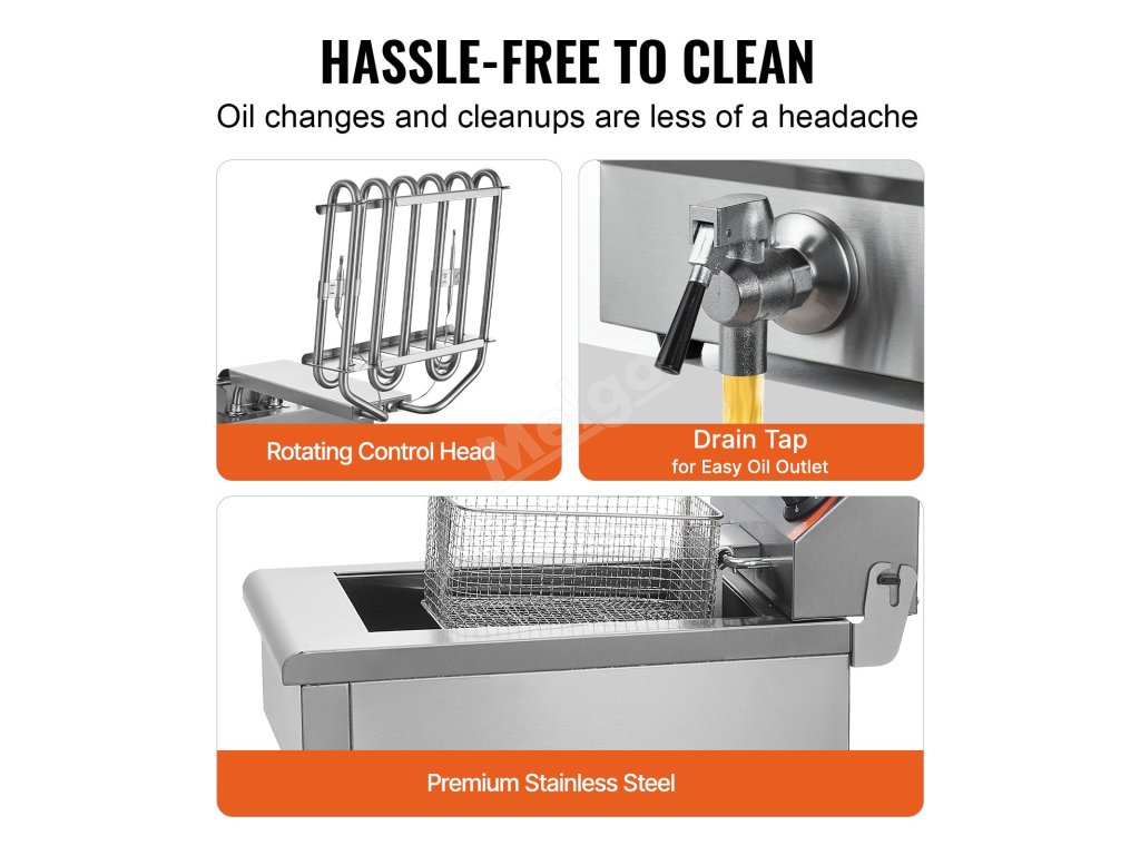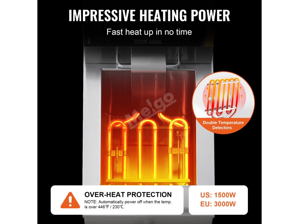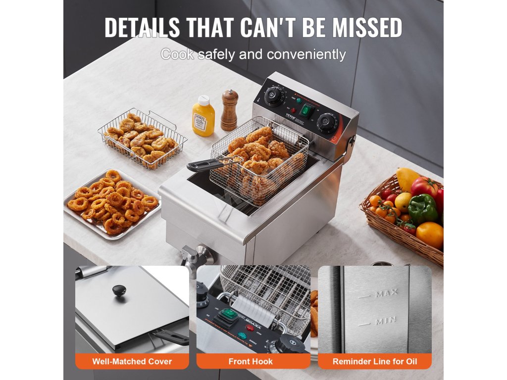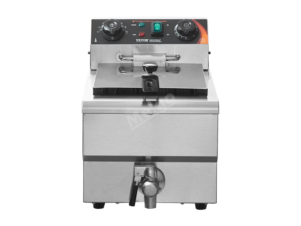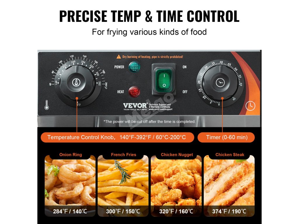 Teplotu lze snadno nastavit v rozmezí 60 až 200 °C. Komerční fritéza se automaticky vypne, pokud teplota překročí 230 °C nebo pokud dojde k poruše regulátoru teploty. Je také vybavena časovačem, který vám to připomene.
