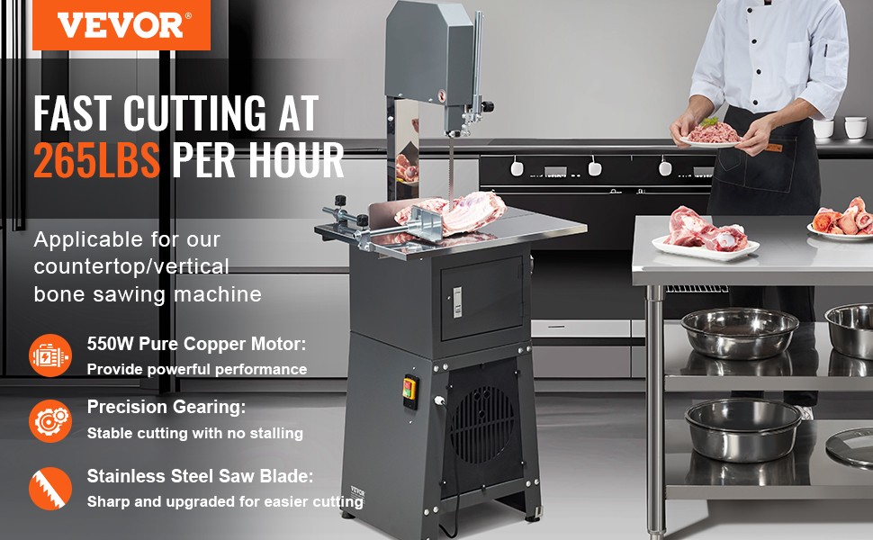 Naše pila na kosti je poháněna 550W motorem z čisté mědi, který poskytuje bezkonkurenční výkon. V kombinaci s ostrými čepelemi z nerezové oceli a přesnými převody stačí k rozřezání tvrdých kostí a mraženého masa jen jemné zatlačení.