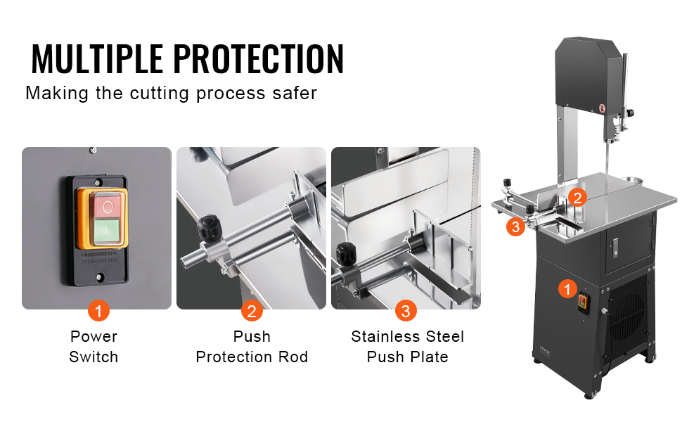 Vaše bezpečnost je pro nás prioritou! Naše pila na maso je vybavena přítlačnou deskou a přítlačnou lištou z nerezové oceli, které udržují vaše ruce během práce mimo dosah ostrého pilového kotouče. Během celého procesu řezání se tak budete cítit jistě a bezpečně.