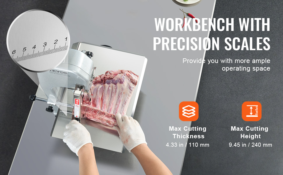 Náš pracovní stůl z nerezové oceli je vybaven přesnou stupnicí, maximální tloušťka řezu je 4,33 mm a maximální výška řezu je 9,45 mm. Nezáleží na tom, zda se jedná o velké kosti z jehněčí kýty nebo hovězí kýty, náš stroj si poradí se všemi.