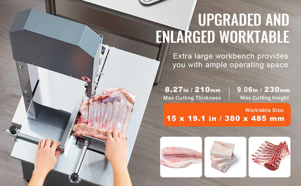 Náš pracovní stůl z nerezové oceli je vybaven přesnou stupnicí. Maximální tloušťka řezu: 7,09 mm, maximální výška řezu: 9,84 mm. Nezáleží na tom, zda se jedná o velké kosti z jehněčí kýty nebo hovězí kýty, náš stroj si poradí se všemi.