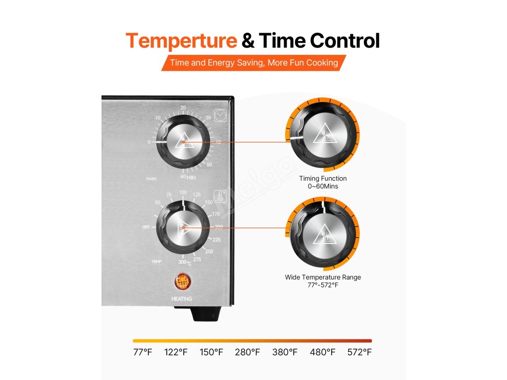 Je vybaven dvěma ovládacími knoflíky pro teplotu a časovač, které umožňují rychlé a přesné nastavení. Vychutnejte si bezproblémový provoz, ať už připravujete pizzu s tenkou kůrkou nebo hluboké talíře.