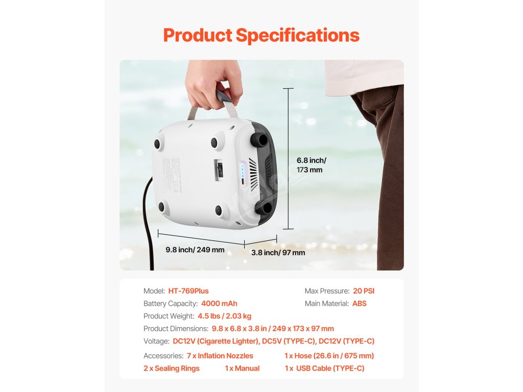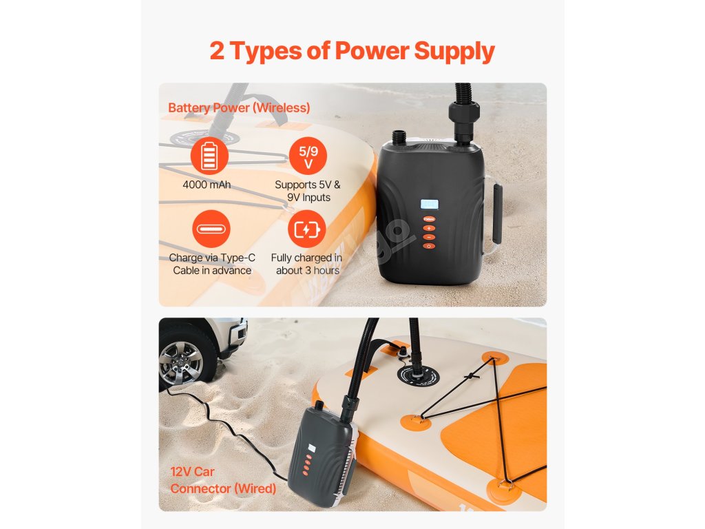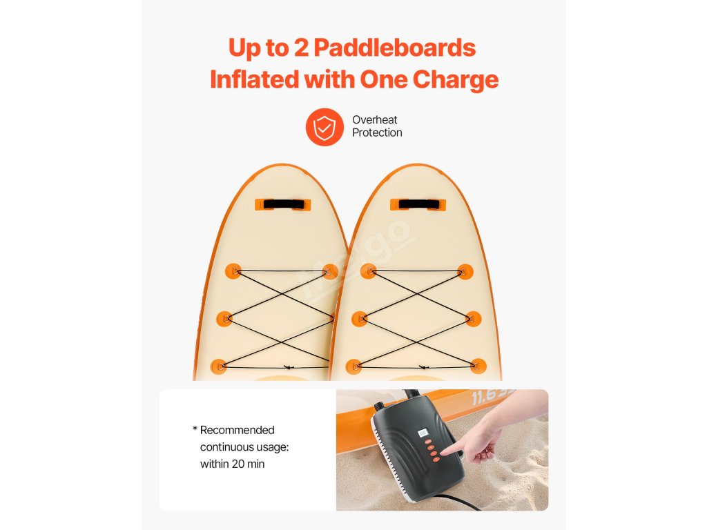 Tato elektrická pumpa na paddleboard je určena pro outdoorové nadšence a nafoukne paddleboard na tlak 12 PSI (9,5 stopy) za 9 minut. Je vybavena digitálním displejem, paměťovou funkcí a baterií 4000 mAh pro použití mimo síť, to vše v lehkém provedení ideálním pro kempování a cestování.