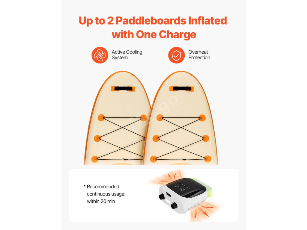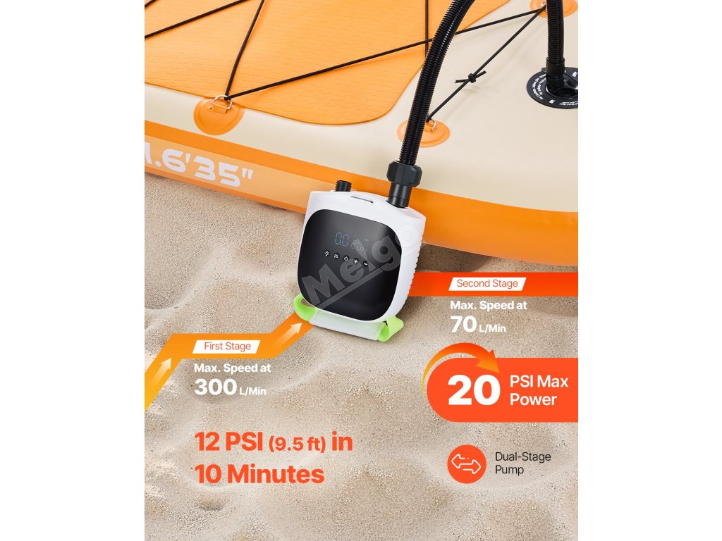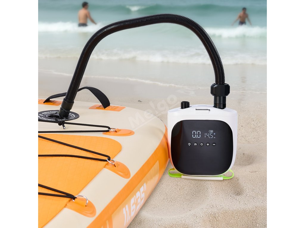Tato elektrická pumpa na paddleboard je určena pro outdoorové nadšence a nafoukne paddleboard na tlak 12 PSI (9,5 stopy) za 9 minut. Je vybavena digitálním displejem, paměťovou funkcí a baterií 4000 mAh pro použití mimo síť, to vše v lehkém provedení ideálním pro kempování a cestování.