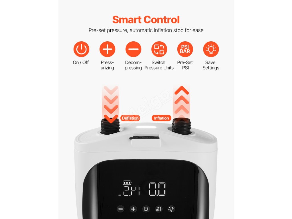 Naše pumpa na paddleboard je vybavena přednastavenými funkcemi, které se automaticky vypnou při dosažení požadovaného tlaku. Displej LED monitoruje tlak v reálném čase a tlačítka se jednoduše a snadno používají. Jednotky lze kdykoli vyměnit.