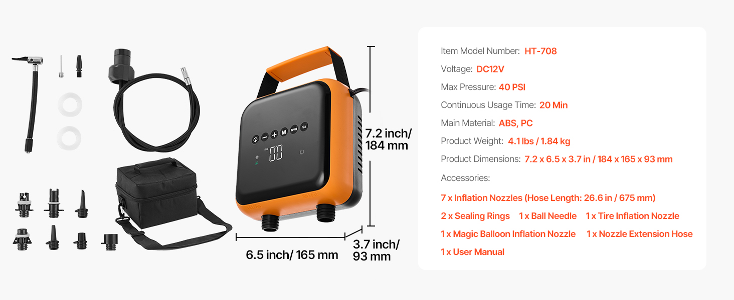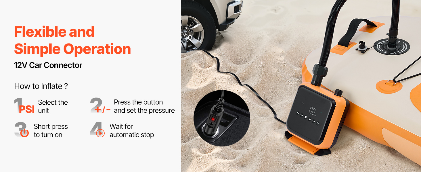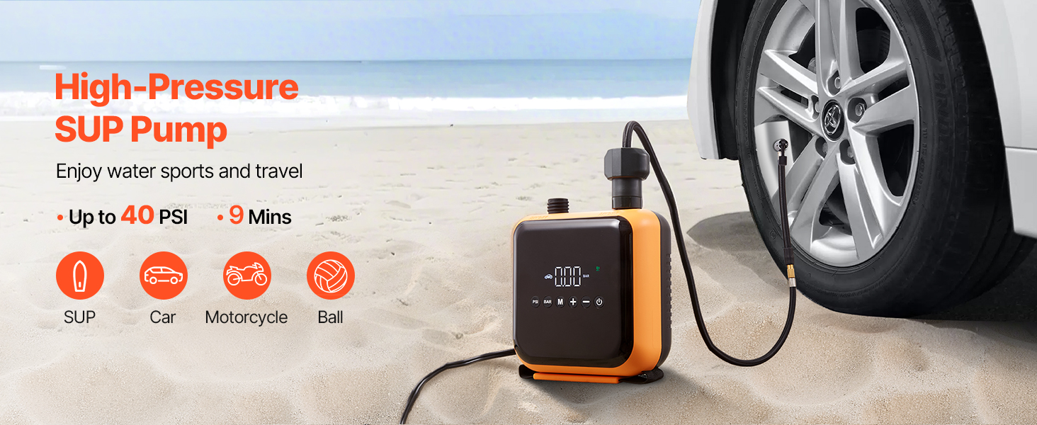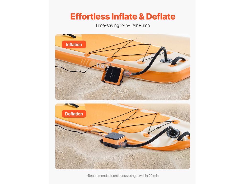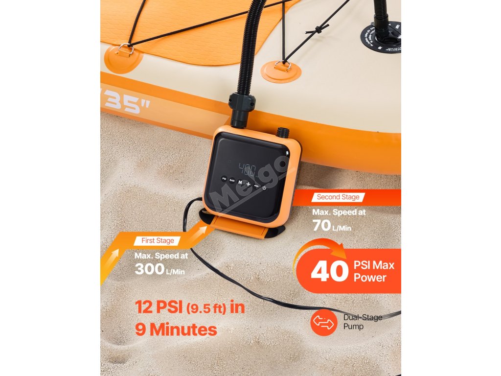 Toto elektrické čerpadlo je určeno pro domácí a automobilové použití a poskytuje tlak 40 PSI se 6 režimy (5 přednastavených + 1 vlastní). Nafoukne SUP na 12 PSI za 9 minut, funguje i na pneumatiky a je vybavena funkcí vypouštění vzduchu pro snadné skladování. Je lehký a ideální pro kempování a cestování.