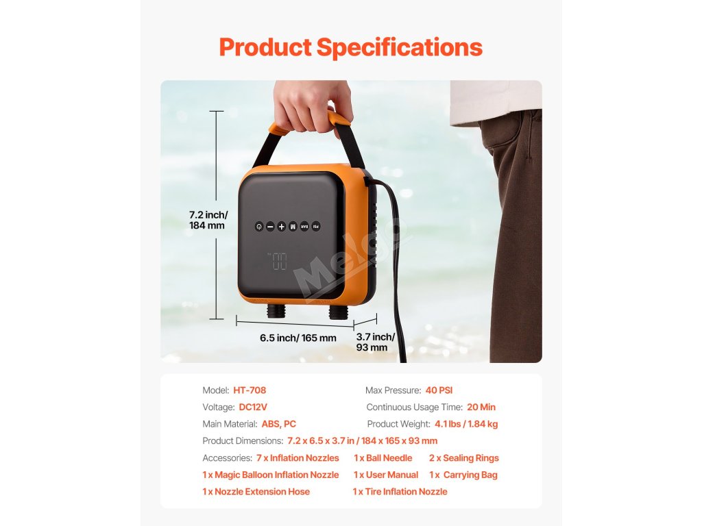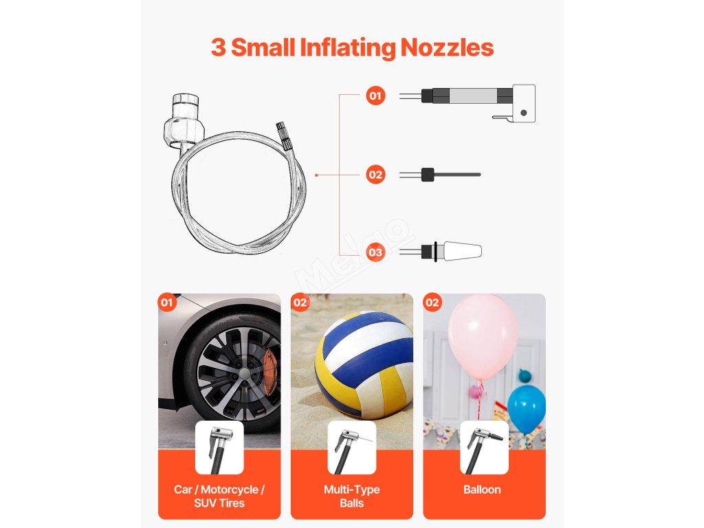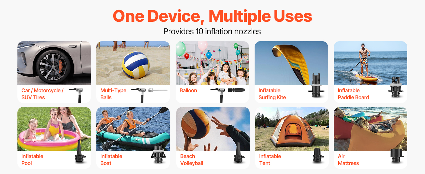 7 standardních trysek + 3 malé trysky, které jsou vhodné pro všechny typy ventilů! Ideální pro rodinné výlety a použití v autě. Skvěle se hodí na pneumatiky, volejbalové míče, SUP, kajaky, nafukovací matrace, plováky do bazénu a další. S touto elektrickou pumpou na paddleboardy se stanete plážovou verzí "MacGyvera"!