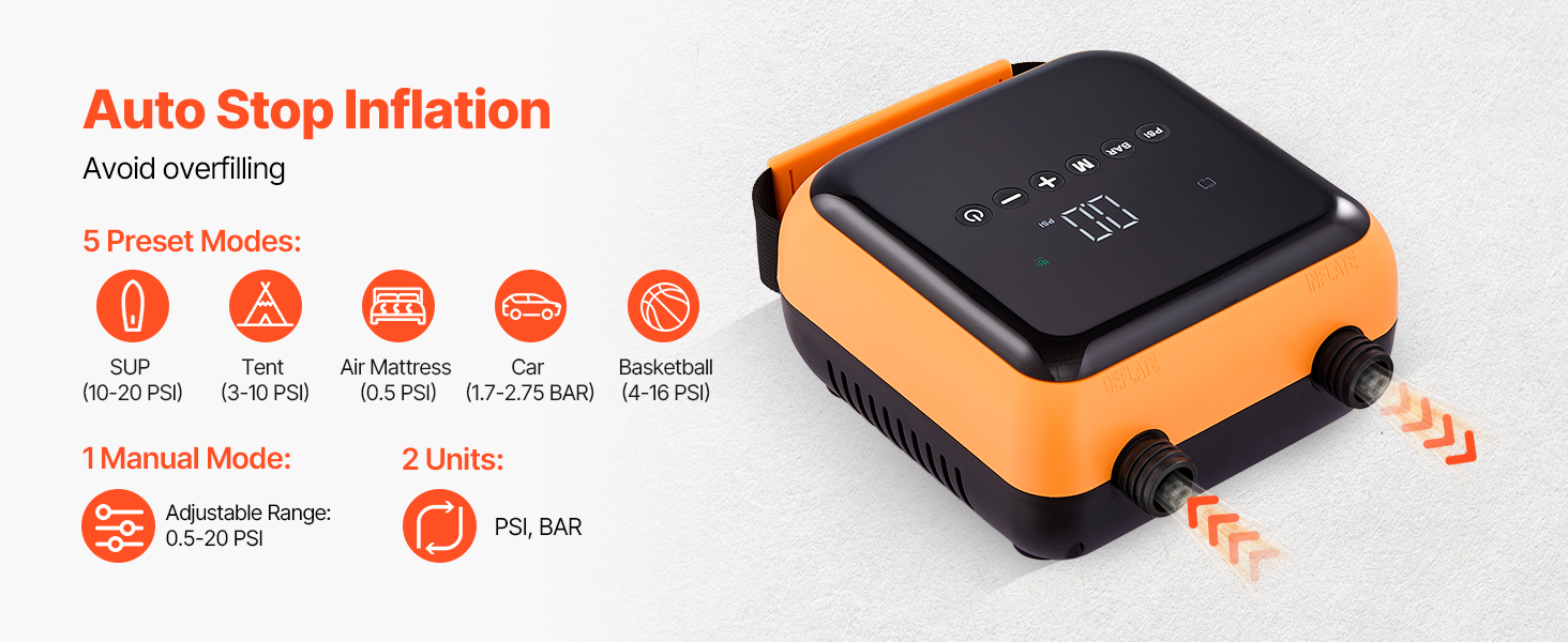 Předvolby pro více režimů (výchozí hodnoty) jsou vhodné pro domácí i automobilové použití. Pumpa na pádlo se automaticky vypne při dosažení cílového tlaku, s monitorováním tlaku v reálném čase a snadno použitelnými tlačítky. Jednotky lze kdykoli přepnout.