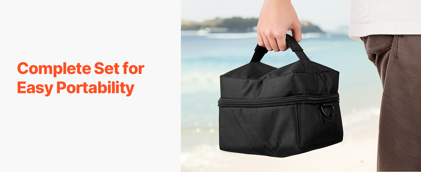 Nabíječku stačí připojit k 12V zdroji napájení v autě a čerpadlo se napumpuje, takže je ideální na mnoho výletů a túr v přírodě. V přenosném batohu je přehledně uloženo veškeré příslušenství.