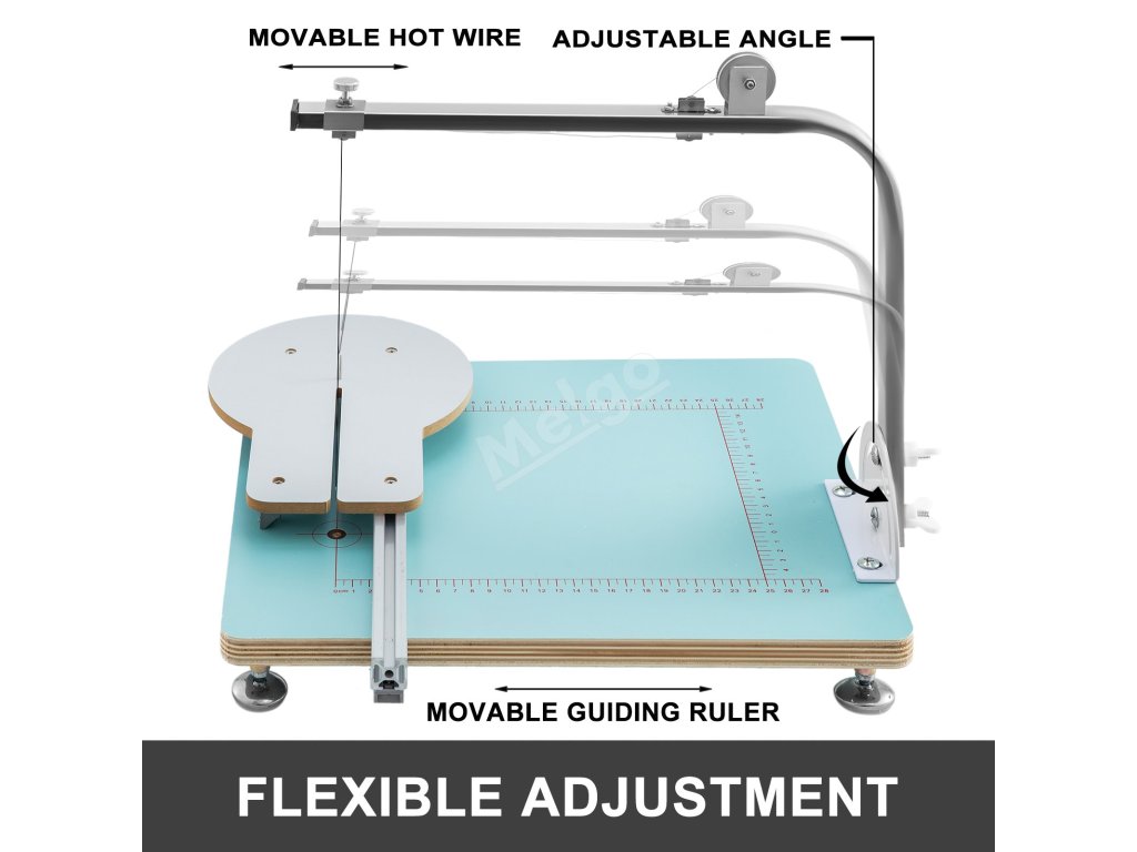 Úhel sloupku a topného drátu a polohu vodicího pravítka lze libovolně nastavit podle požadavků na řezání.