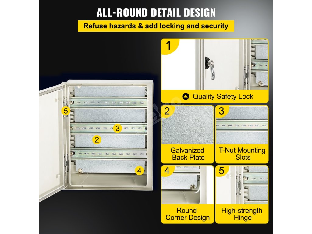 Pozinkovanou zadní desku lze snadno sejmout a nainstalovat. Černý plech se vyznačuje vysokou pevností a odolností proti oxidaci. Montážní otvory s T-maticemi pro vodicí lišty DIN a zaoblené rohy zabraňují poškození kabelů.