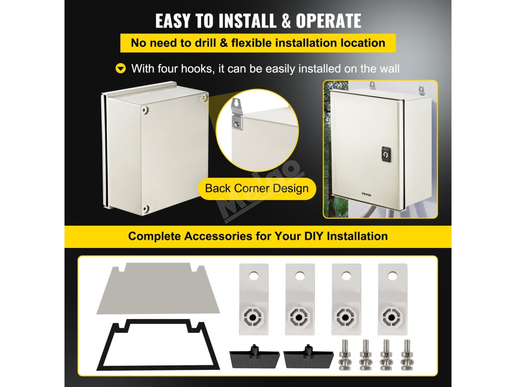 Čtyři montážní otvory na zadní straně vyžadují minimální úsilí uživatele při montáži elektrické skříně na stěnu. pro pohodlné použití jsou k dispozici také 3 x vodicí lišty a 1 x sada závěsného příslušenství.