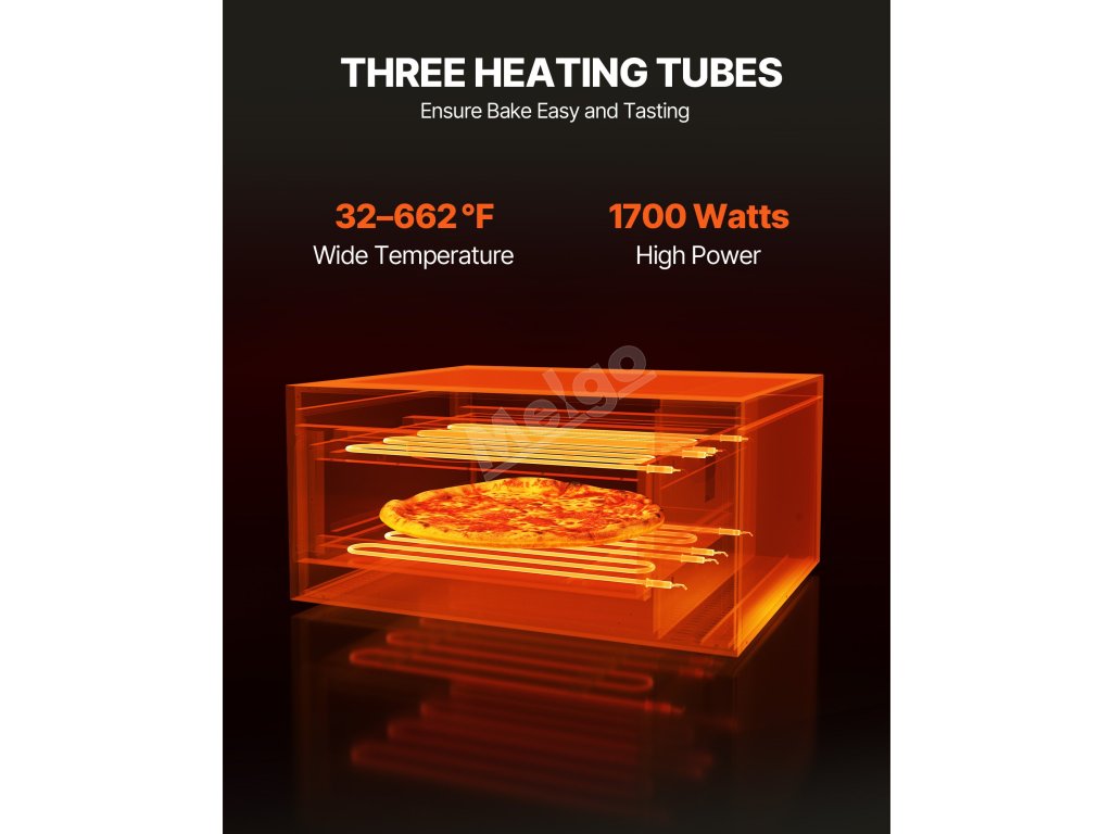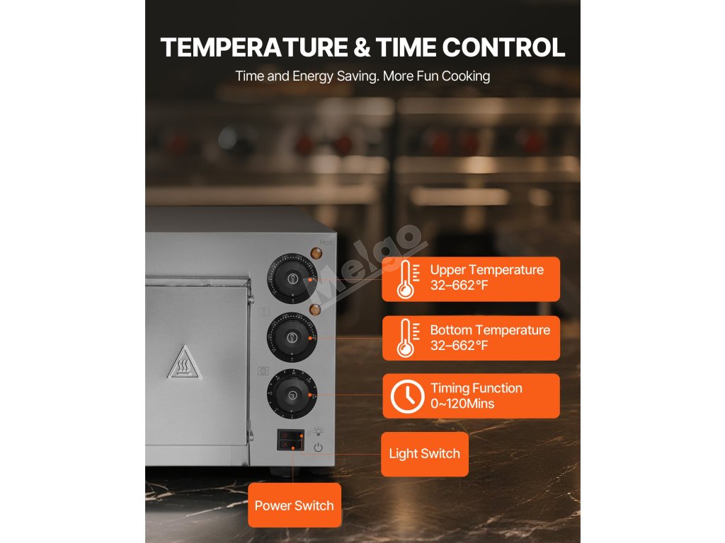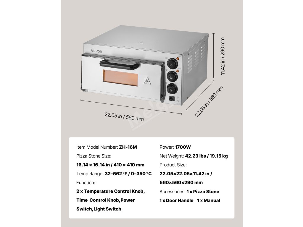 Elektrická 16palcová pec na pizzu VEVOR se může pochlubit konstrukcí z potravinářské nerezové oceli, přesnou regulací teploty 122-662℉/50-350 ℃. Vysoký výkon a dvě topné trubice zajišťují rovnoměrné a efektivní rozložení tepla pro vždy dokonalé výsledky pečení!