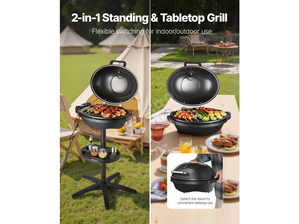 Tento elektrický gril 2 v 1 se snadno mění ze stolního na stojící režim. Ať už grilujete s rodinou uvnitř nebo pořádáte venkovní setkání s přáteli, tento všestranný gril vám zajistí zábavné a chutné grilování.