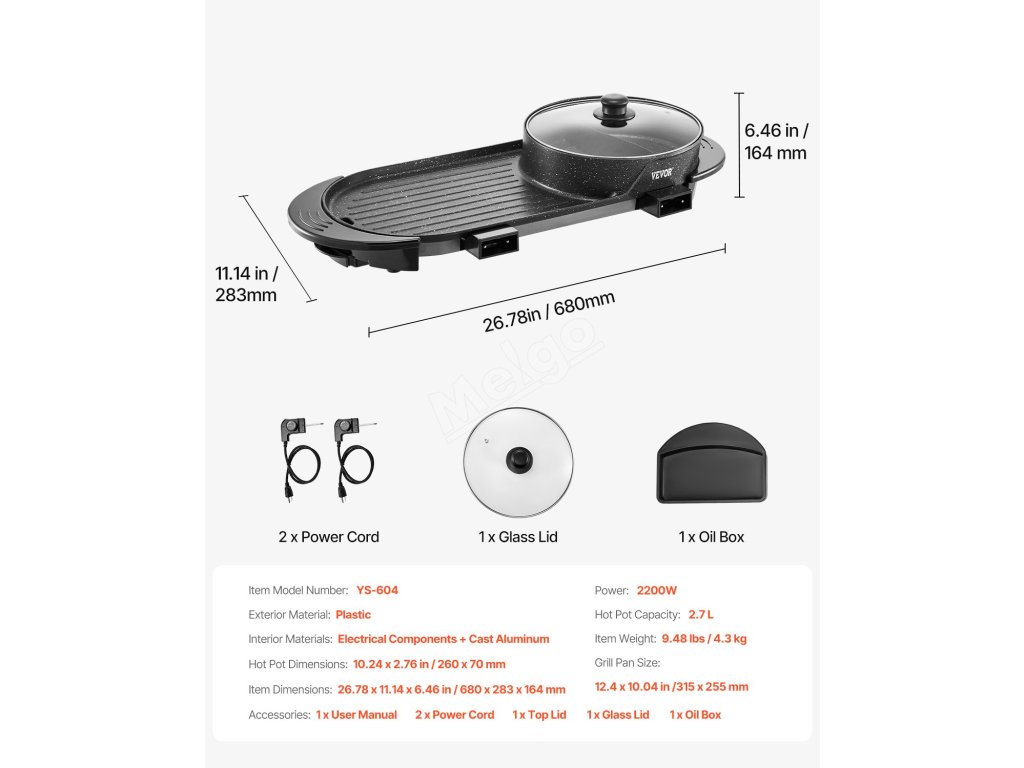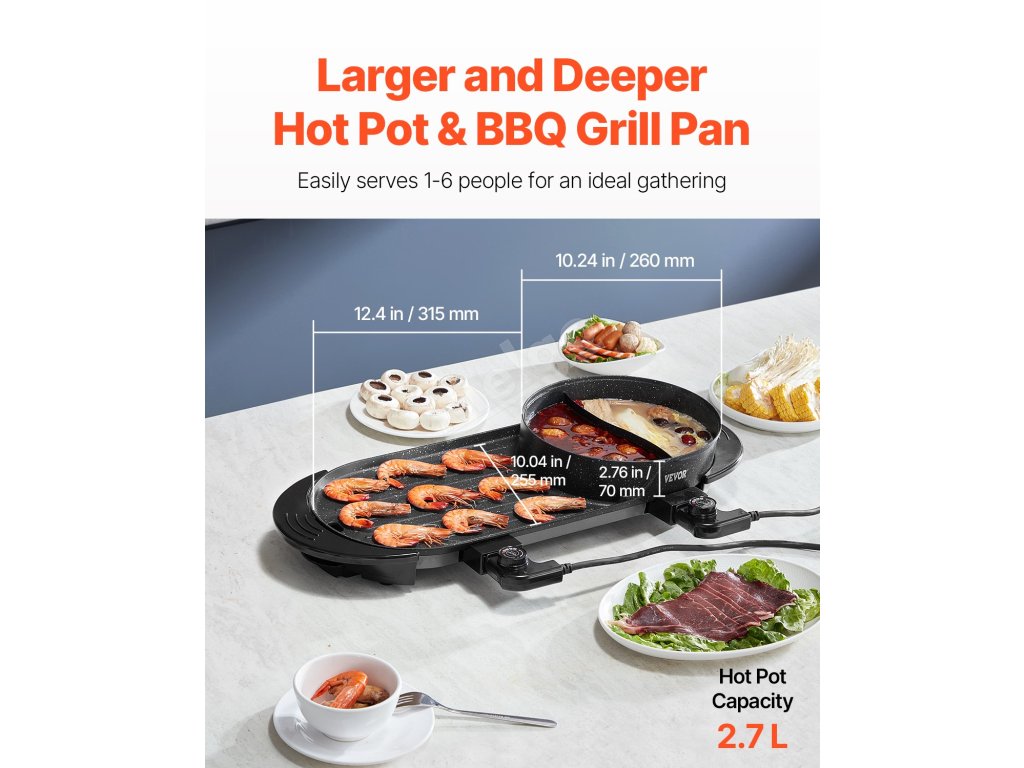 Naše kombinace 2,7 l horkého hrnce a grilu obsahuje horký hrnec o rozměrech 260 x 70 mm (10,24 x 2,76 palce) a grilovací pánev o rozměrech 315 x 255 mm (12,4 x 10,04 palce), takže je dostatečně velká pro přípravu plnohodnotného jídla pro rodinu a přátele.
