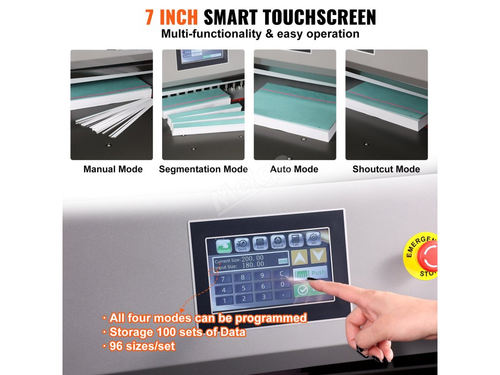 Pro pohodlí uživatele je navržen 7palcový dotykový displej. Nabízí čtyři režimy řezání, nastavitelná datová nastavení až pro 100 sad 96 velikostí a diagnostiku systému pro bezproblémový provoz.