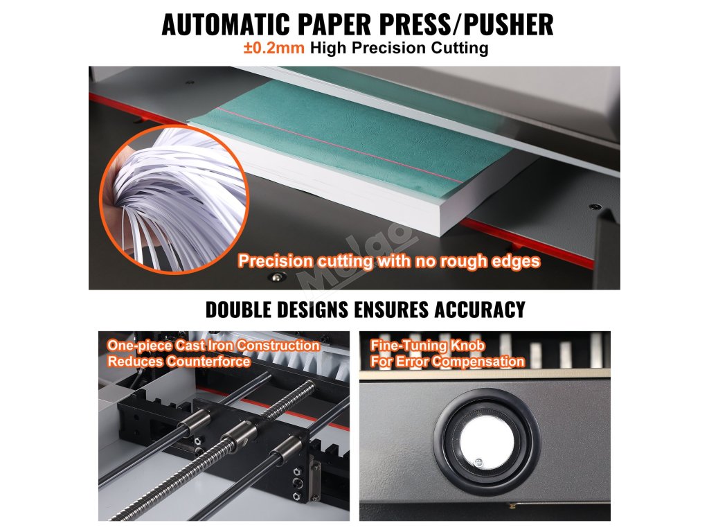 Několik funkcí pro udržení přesnosti řezání v rozmezí ±0,2 mm. Infračervené navádění pro jasné polohování, automatický přítlak a podávání papíru pro minimalizaci vlivu člověka, jednodílné litinové tělo pro snížení řezných sil a chyb a ruční doladění pro kompenzaci rozdílů ve velikosti.