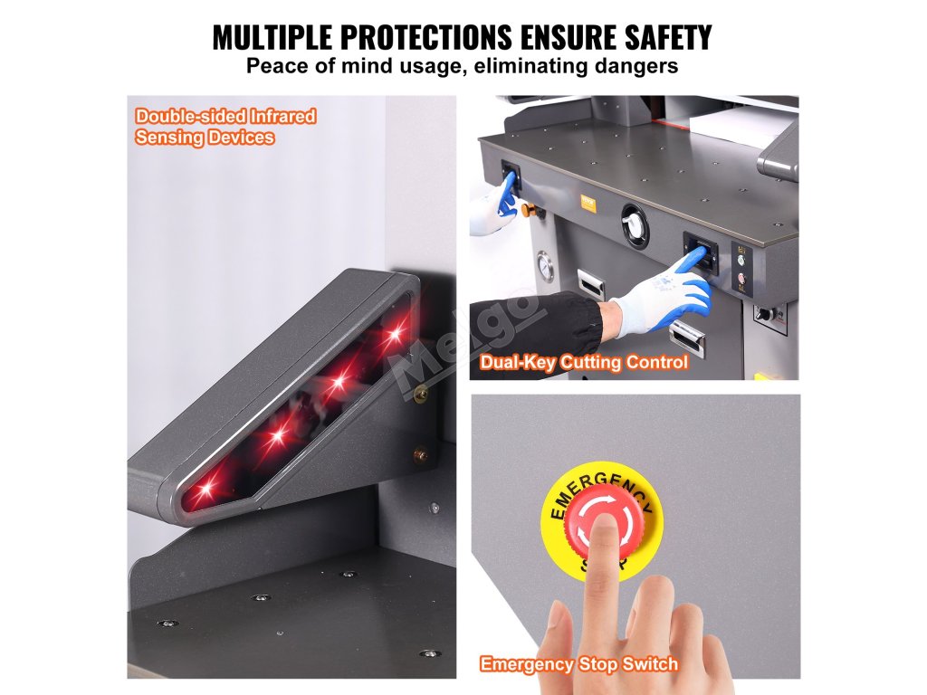 Abychom zajistili bezpečnost při práci, zabudovali jsme na každou stranu infračervené senzory, které zastaví elektrický ořezávač papíru při detekci cizích předmětů. Aktivace dvěma tlačítky zabraňuje náhodnému spuštění a nouzový vypínač zajišťuje okamžité vypnutí v případě nouze.