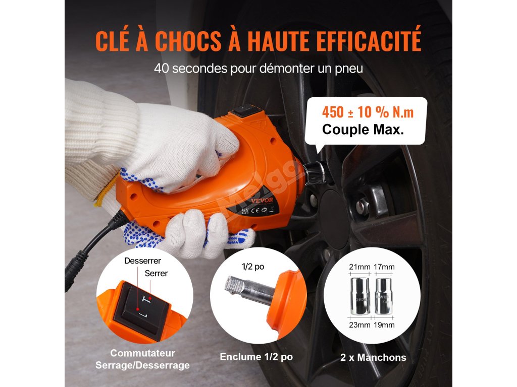 Súprava má vysokoúčinný elektrický rázový uťahovák, ktorý dokáže poskytnúť krútiaci moment 450 Nm. Výmenu pneumatík môžete vykonať rýchlo a jednoducho a demontáž alebo dotiahnutie matíc závesov vykonať v priebehu niekoľkých sekúnd. Obsahuje dve objímky, ktoré sa prispôsobia štyrom bežným veľkostiam matíc (17/19 mm a 21/23 mm), a je tak kompatibilná s väčšinou skrutiek kolies.