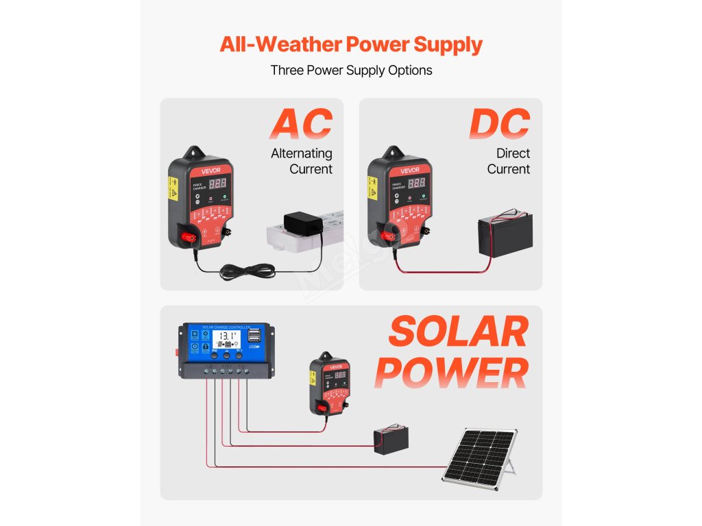 Napájení elektrického ohradníku podporuje střídavý, stejnosměrný a solární proud, což umožňuje flexibilní zdroje energie podle vašich potřeb. AC/DC se připojuje přímo pomocí adaptéru nebo aligátorových svorek, zatímco solární napájení poskytuje ekologickou energii pro stabilní provoz ohradníku.
