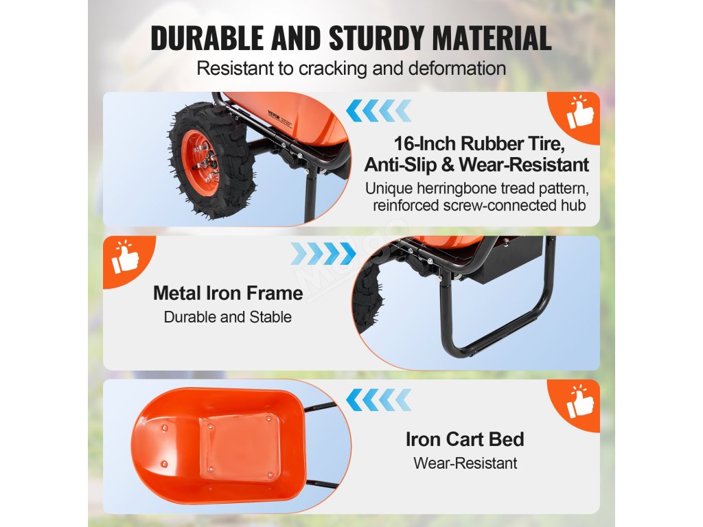 Elektrický zahradní sklápěč má pevný železný rám a zásobník a gumové pneumatiky odolné proti opotřebení, takže je spolehlivý pro venkovní použití.