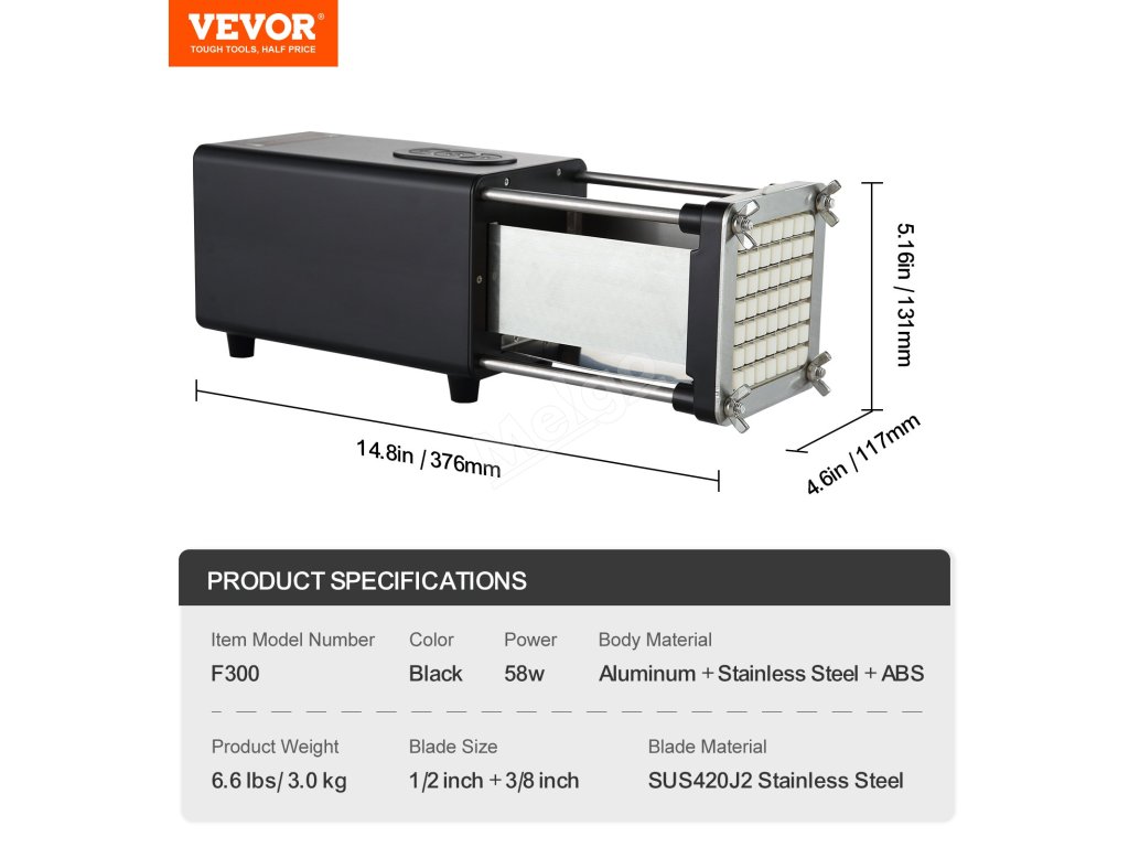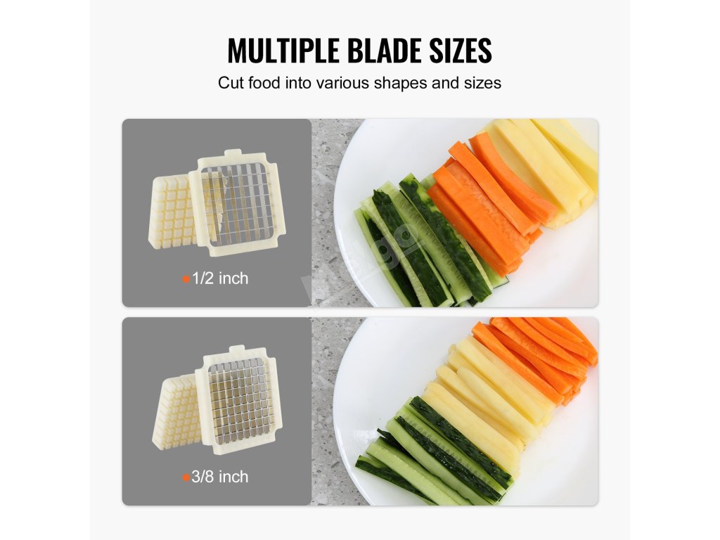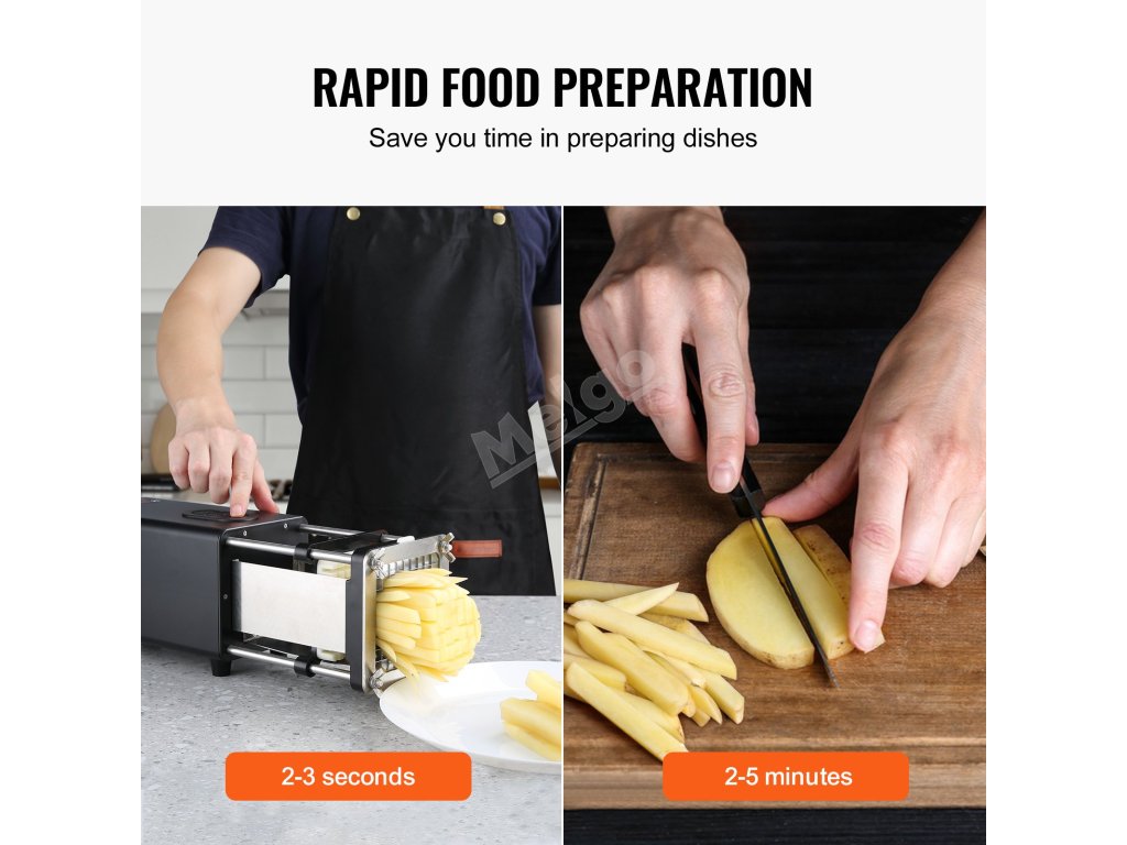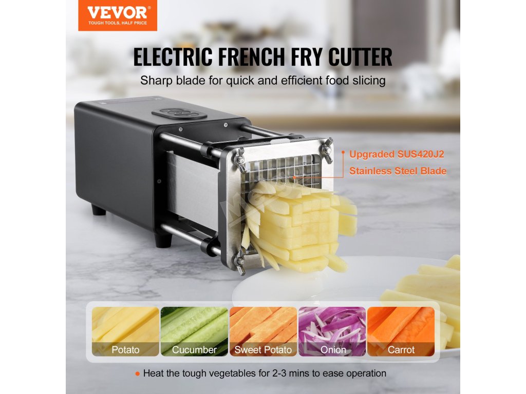 Kráječ na třísky VEVOR je vybaven ostrými noži z nerezové oceli a protiskluzovými nožičkami pro lepší stabilitu. Bez námahy nakrájí zeleninu, jako jsou brambory, mrkev, okurky, a dokonce i tvrdší druhy, například sladké brambory.