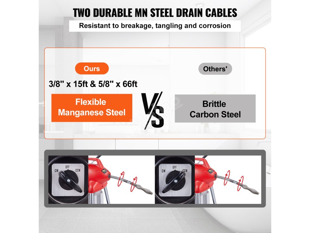 Stroj na čištění kanalizace se dodává s odolnými ocelovými sekčními lany: 66 FT x 5/8" a 15 FT x 3/8". Tato lana jsou pečlivě zpracována s povrchovým kalením, aby odolávala zlomení, kroucení a korozi a snadno procházela více zakřivenými trubkami.
