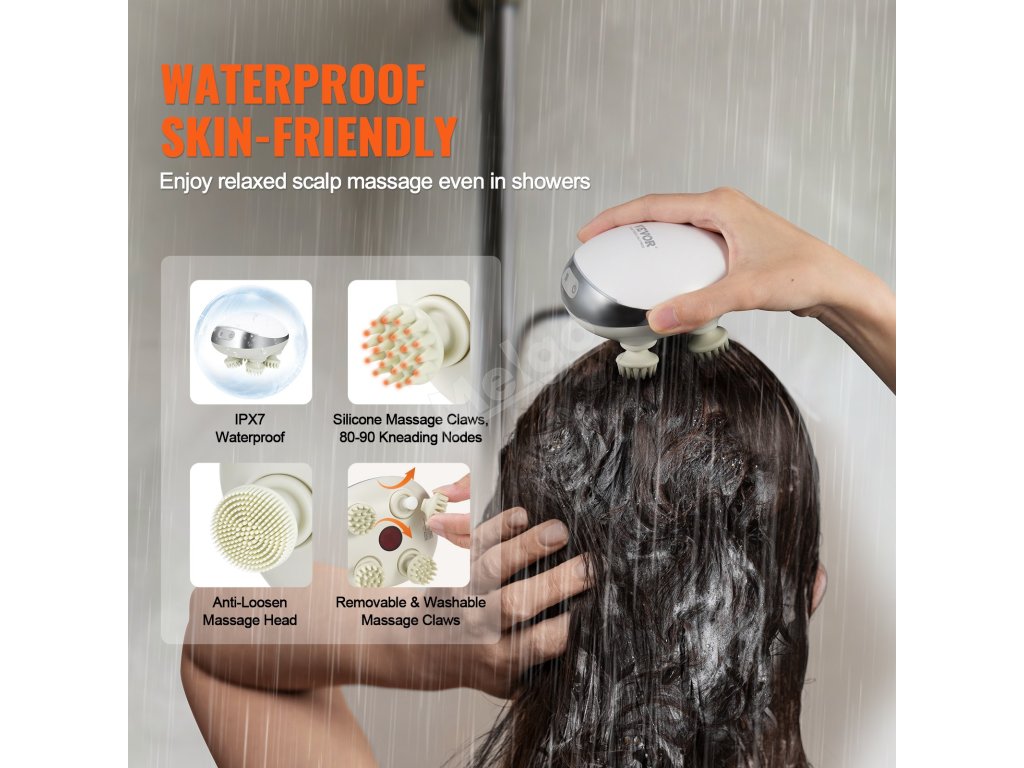 Voděodolná ruční škrabka na vlasy a pokožku hlavy je vybavena ergonomickou rukojetí pro pohodlné uchopení, která zajišťuje dlouhotrvající pohodlí při používání. Její měkké silikonové masážní drápy s 80-90 hnětacími uzly zabraňují zamotávání vlasů, takže každá masáž je pohodlná a příjemná.