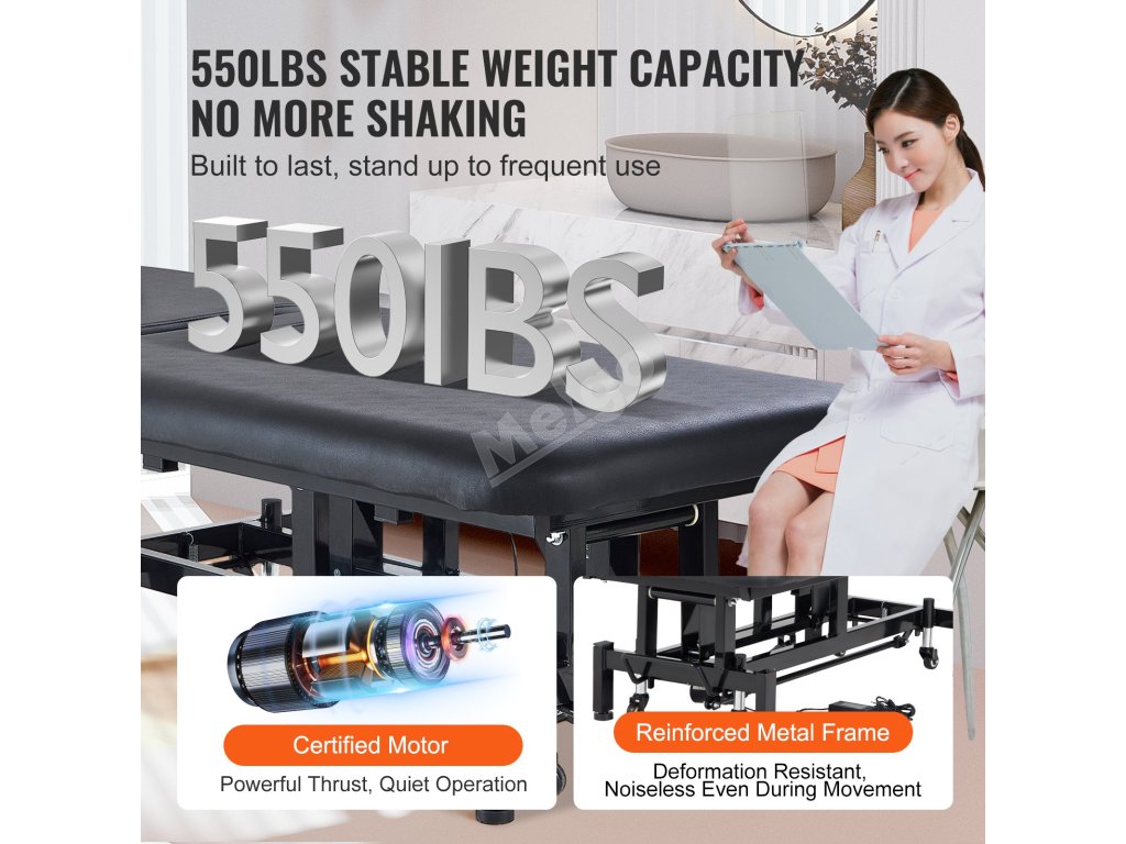 Naše profesionální elektrické masážní lůžko je podepřeno zesíleným kovovým rámem, který zajišťuje spolehlivou oporu a odolnost proti deformaci. Je navrženo s vícebodovou silovou konstrukcí, vydrží zatížení až 550 kilogramů a vyhoví různým masážním potřebám.