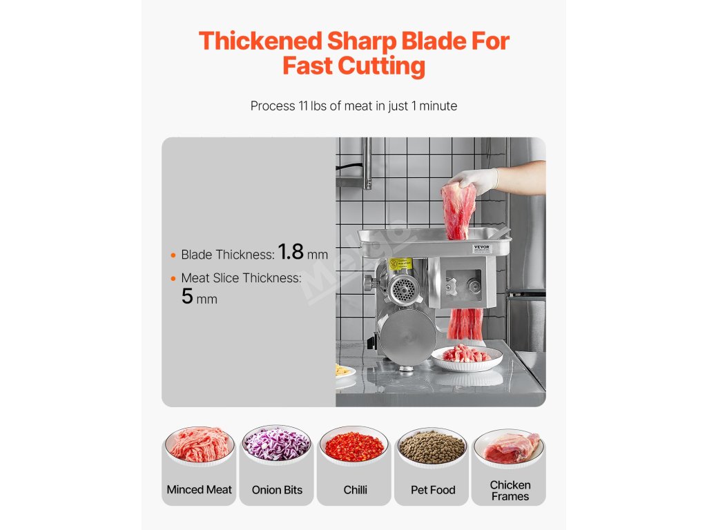 Tento komerční mlýnek na maso a kráječ je vhodný pro mletí a krájení masa, ryb a zeleniny a je ideální pro kuchyně, restaurace a továrny - slouží jak pro osobní, tak pro komerční potřeby.