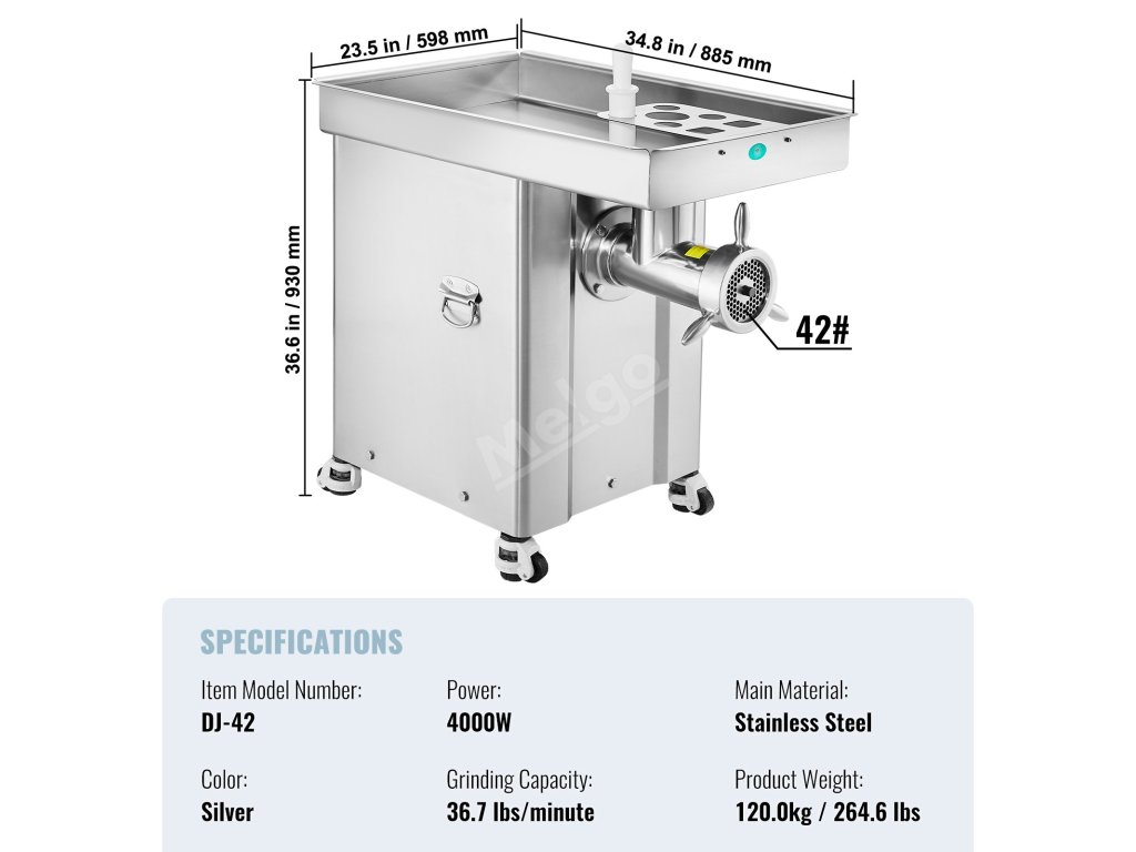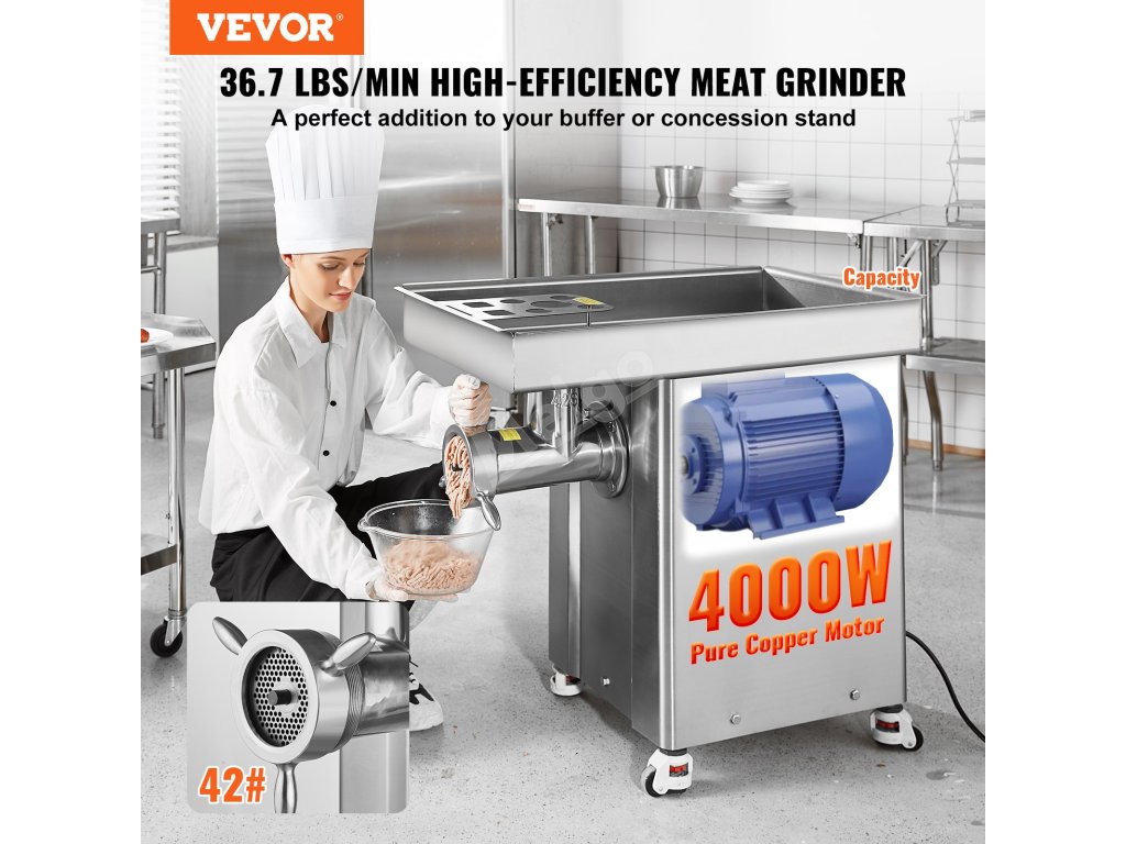 Komerční mlýnek na maso o velikosti ústí 42# je vybaven vysoce účinným 4000W motorem z čisté mědi, který dokáže umlít 36,7 kg masa za minutu. Mlýnek může pracovat nepřetržitě více než 6 hodin, takže je ideální pro potřeby komerčního mletí masa ve velkém měřítku.