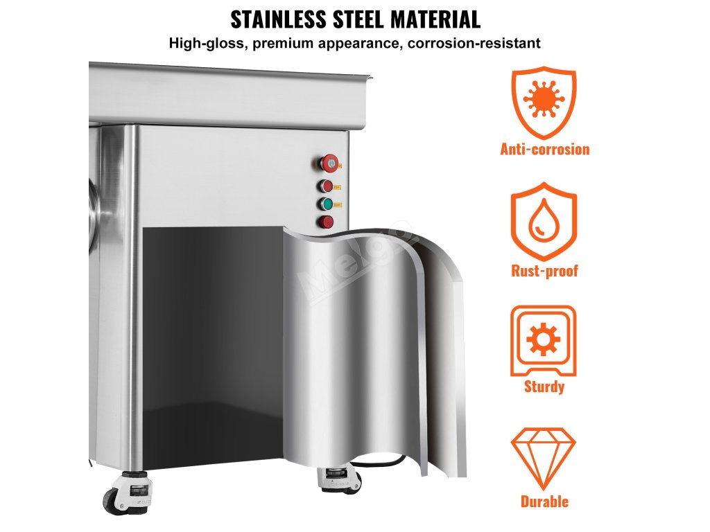 Mlýnek na maso je vybaven 4 pohyblivými koly, z nichž 2 jsou opatřena brzdami, takže jej můžete bez námahy přemístit na libovolné místo. Je vhodný zejména pro použití v řeznictvích, supermarketech, restauracích rychlého občerstvení, hotelech a potravinářských zařízeních.