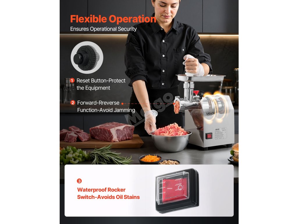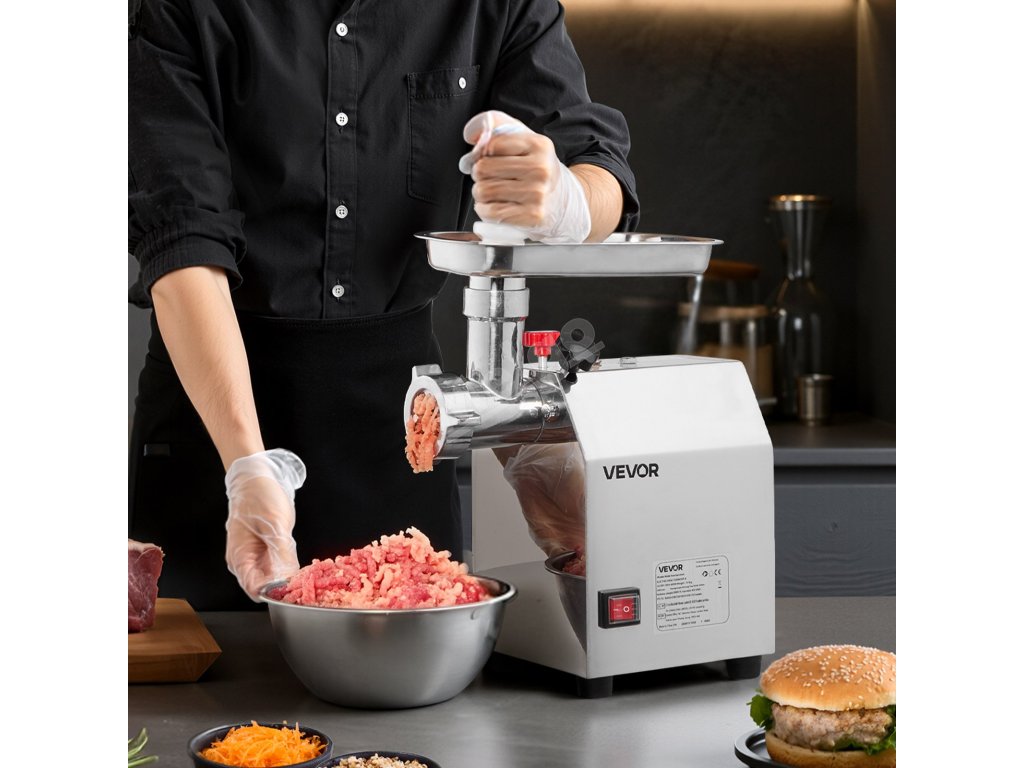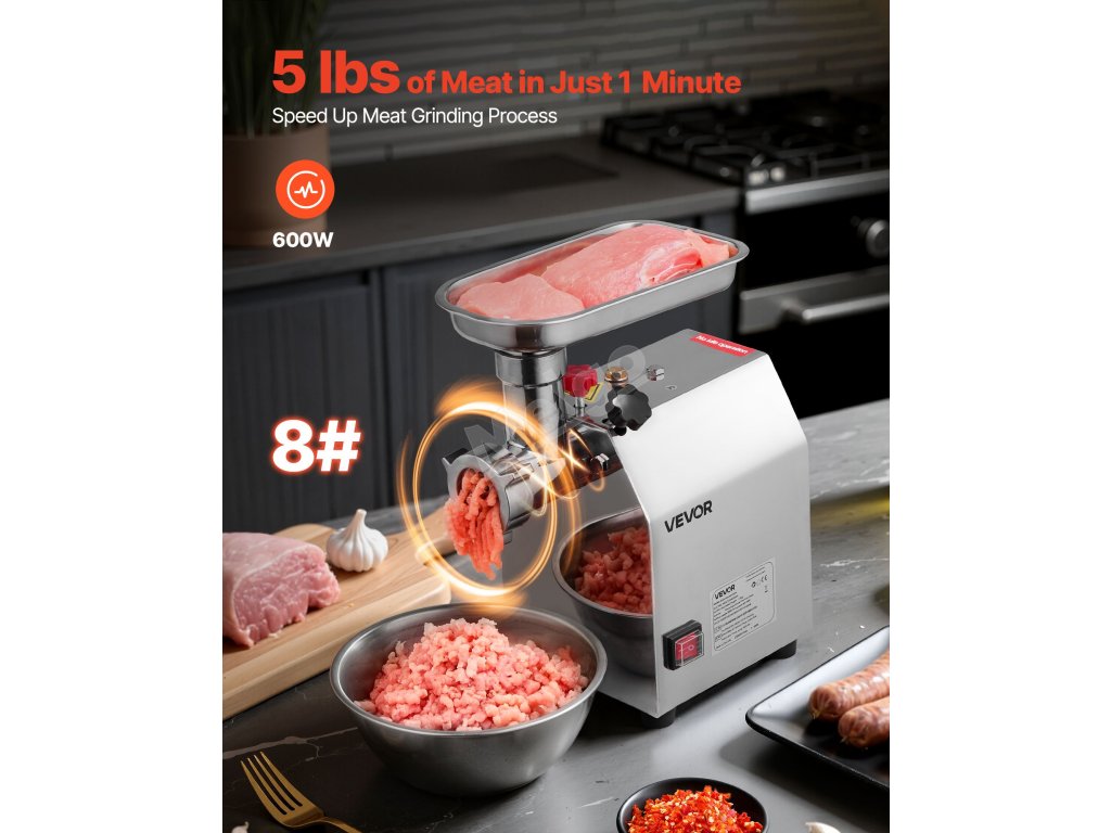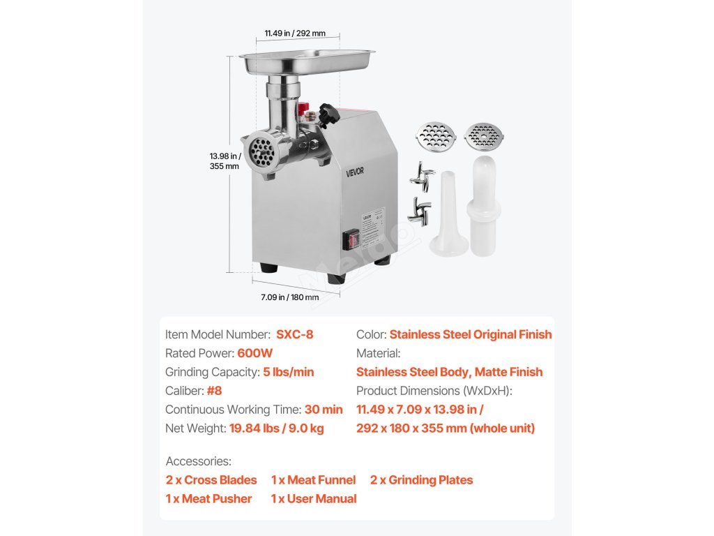 Komerční stolní mlýnek na maso o velikosti ústí 8# je vybaven vysoce účinným 600W motorem z čisté mědi, který dokáže umlít 4,5 kg masa za minutu. Je vyroben z nerezové oceli, je robustní a odolný. Pro komerční použití je ideální nůž SUS420, který dokáže umlít různé druhy masa.
