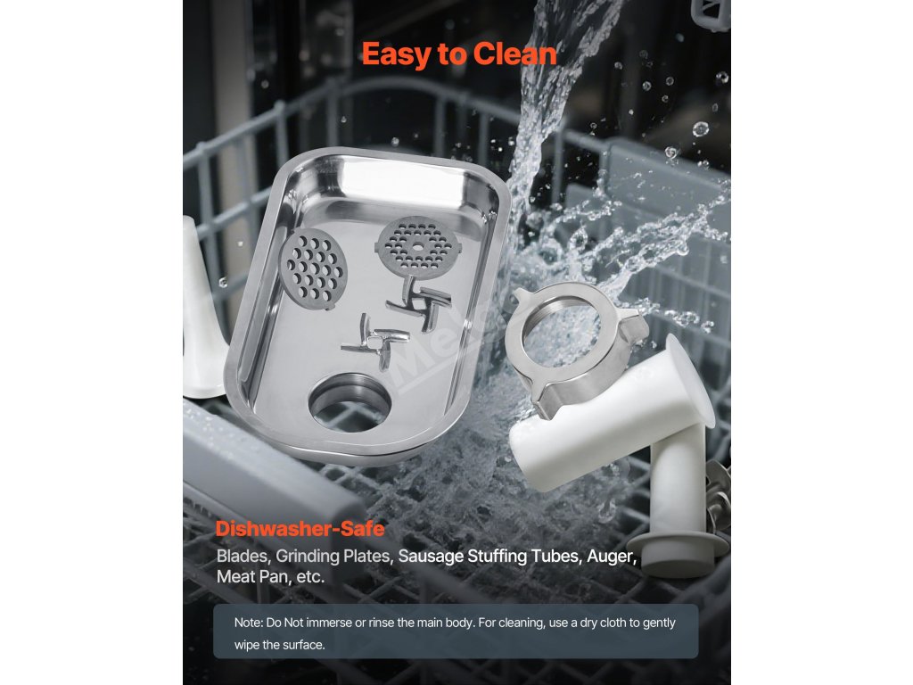 600wattový motor z čisté mědi dokáže umlít 4,5 kg masa za minutu. Elektrický mlýnek na maso může pracovat nepřetržitě bez přerušení, takže je ideální pro rozsáhlé komerční potřeby mletí masa.