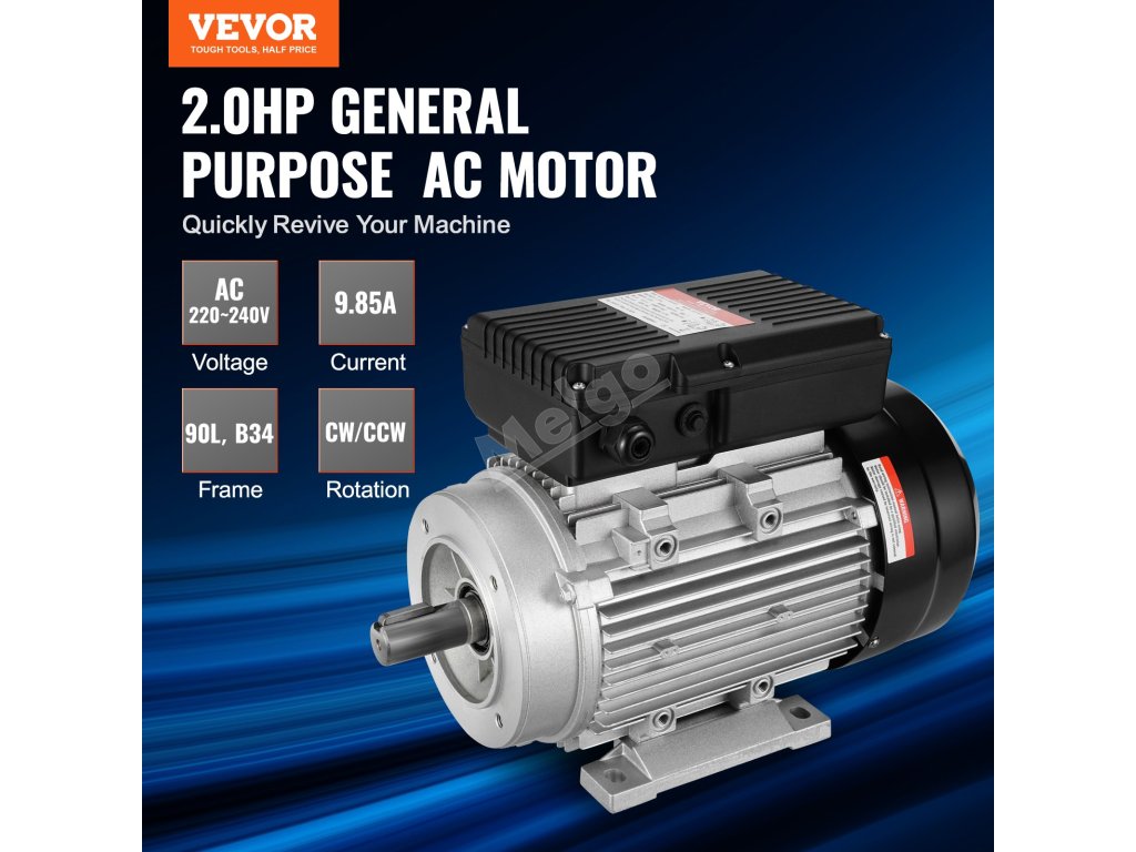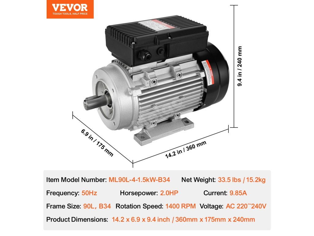 Dodejte svému zařízení silný výkon s elektromotorem VEVOR o výkonu 1,5 kW. Pracuje při 220 ~ 240 V AC s proudem 9,85 A, má vysoké otáčky 1400 min-1, 90 L, rám B34, délku hřídele 50 mm, hřídel s drážkou 24 mm a duální směr otáčení CW/CCW.