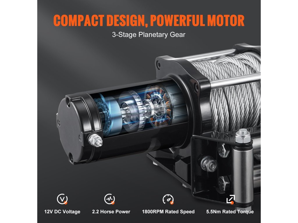 Používá vysoce výkonný 12V motor z čisté mědi se super vysokým výkonem, který doprovází záchranáře v terénu každý den. Přesná třírychlostní planetová převodovka umožňuje navijáku stabilní provoz po dlouhou dobu a je vybavena systémem volnoběžné převodové spojky.