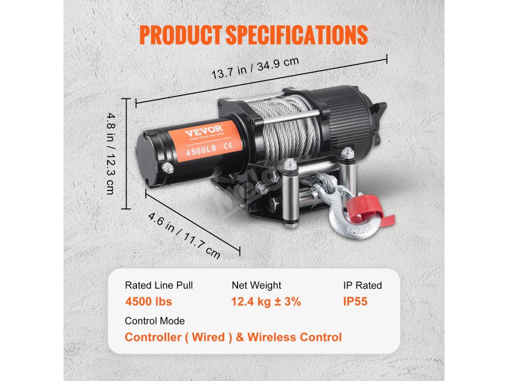 Elektrický naviják 12V 4500 lb 1/4”×39ft s dálkovým ovladačem ip55