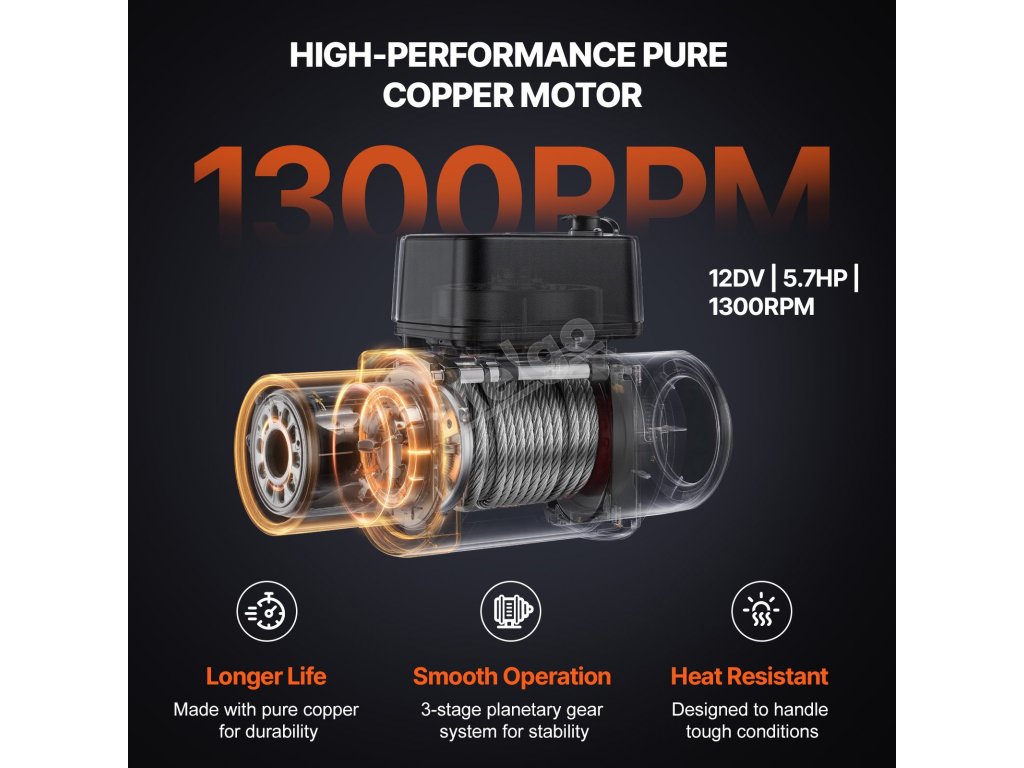 Náš elektrický naviják je poháněn robustním měděným motorem o výkonu 12 V DC/5,7 HP, který vždy poskytuje konzistentní a efektivní výkon. Díky pokročilé planetové převodovce a převodovému poměru 312,4:1 si užijete hladký a spolehlivý tah lana i v náročných povětrnostních podmínkách nebo hlubokém bahně.