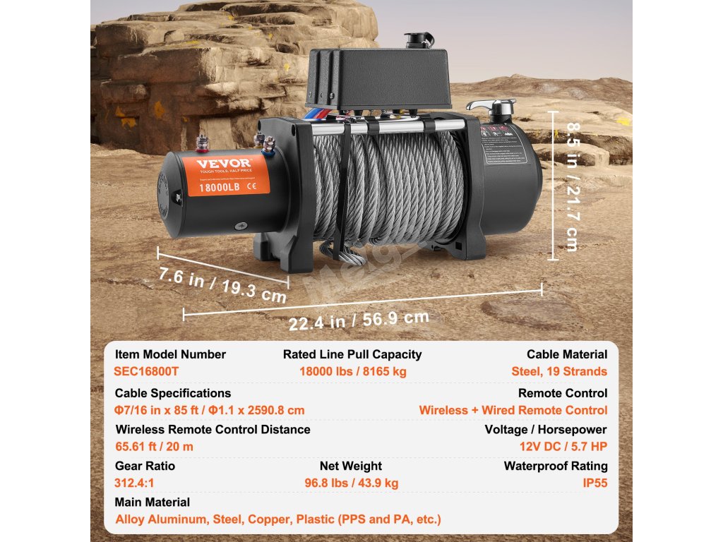 Náš naviják pro těžké nákladní vozy má tažnou kapacitu 18 000 liber a vodotěsnost IP55, což je ideální pro vytažení vašeho terénního vozidla nebo SUV z lepkavých blátivých jam nebo silného deště. S měděným motorem 12 V DC/5,7 HP, převodovým poměrem 312,4:1 a ocelovým lanem budete vždy připraveni.
