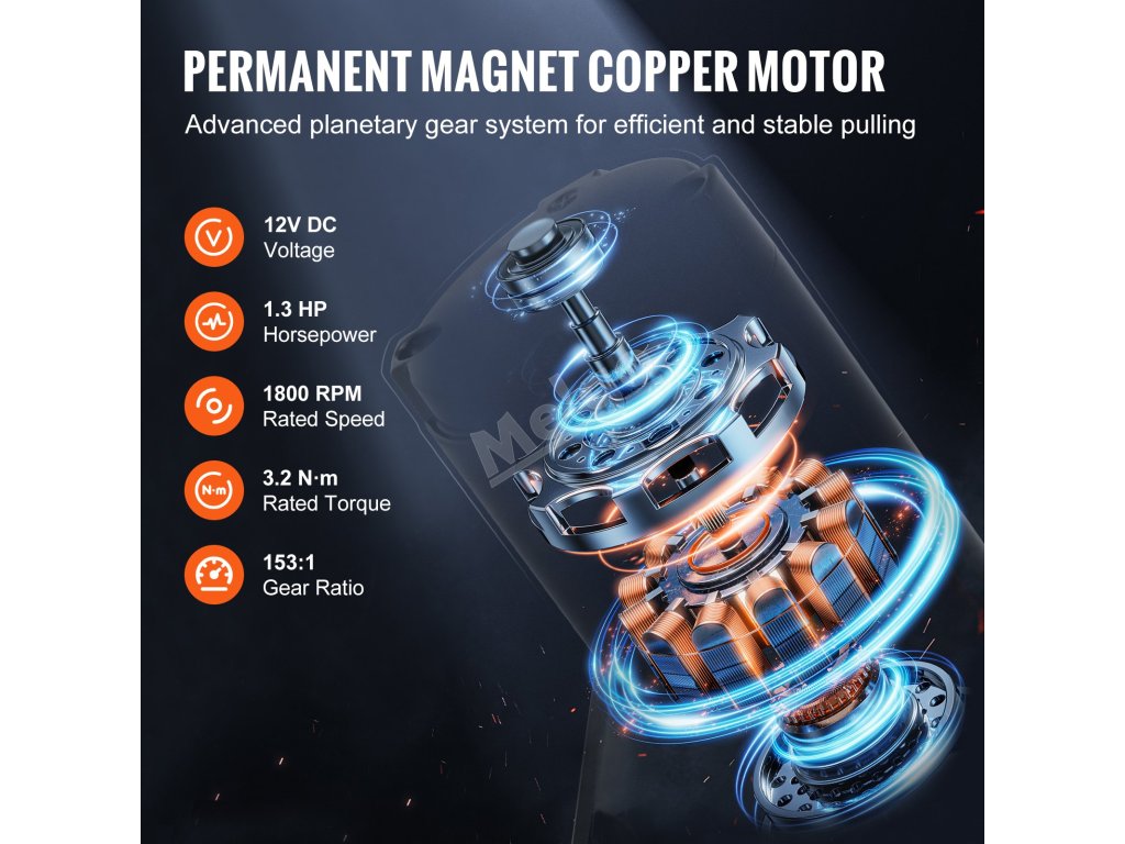 Náš elektrický naviják je poháněn robustním měděným motorem o výkonu 12 V DC/1,3 HP, který vždy poskytuje konzistentní a efektivní výkon. Díky pokročilé planetové převodovce a převodovému poměru 153:1 si užijete hladký a spolehlivý tah lana i v náročných povětrnostních podmínkách nebo hlubokém bahně.