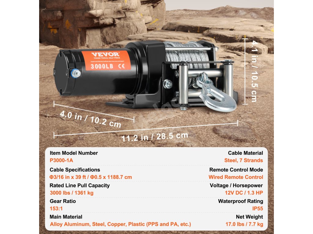 Náš těžký elektrický naviják s tažnou silou 3000 liber a vodotěsností IP55 je ideální pro vytažení vašeho čtyřkolky nebo UTV z lepkavých bahenních jam. Je vybaven měděným motorem s permanentním magnetem o výkonu 12 VDC/1,3 HP, převodovým poměrem 153:1 a ocelovým lanem, což zaručuje, že nikdy nezůstanete dlouho uvězněni.