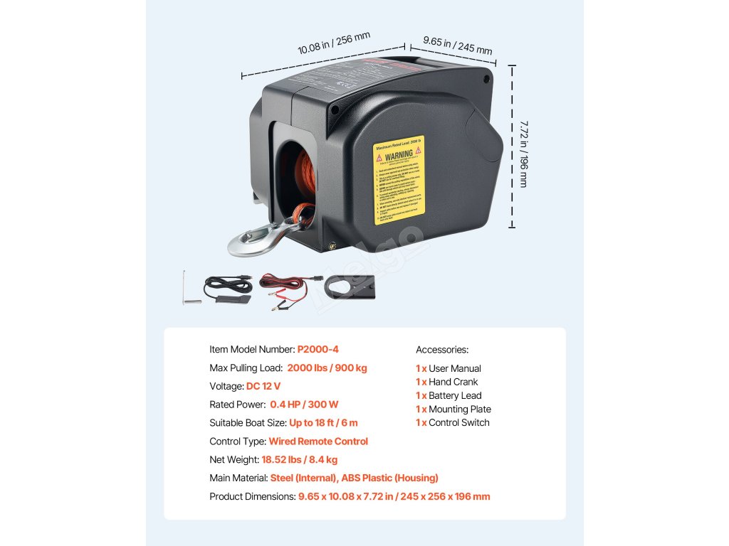 Tento elektrický lodní naviják je vaším pomocníkem při vlečení lodí. Je vybaven měděným motorem pro solidní tažnou sílu, odolným lanem pro bezpečné tažení, dvěma režimy ovládání a odolným pláštěm z ABS, který je vyroben tak, aby vydržel.