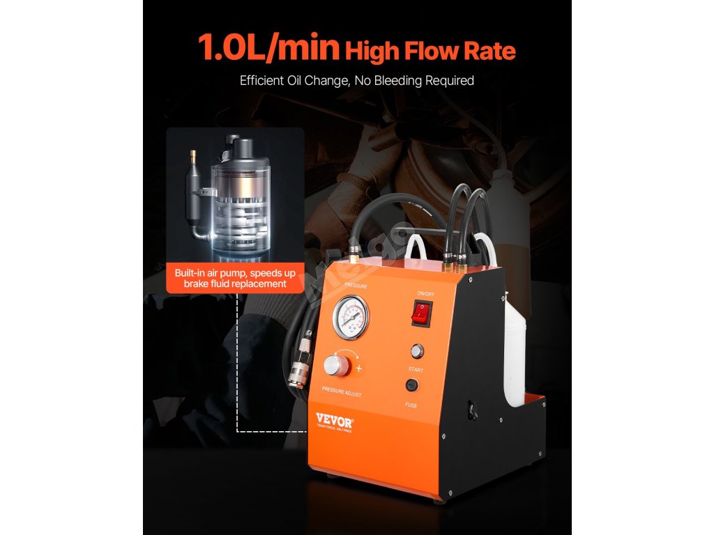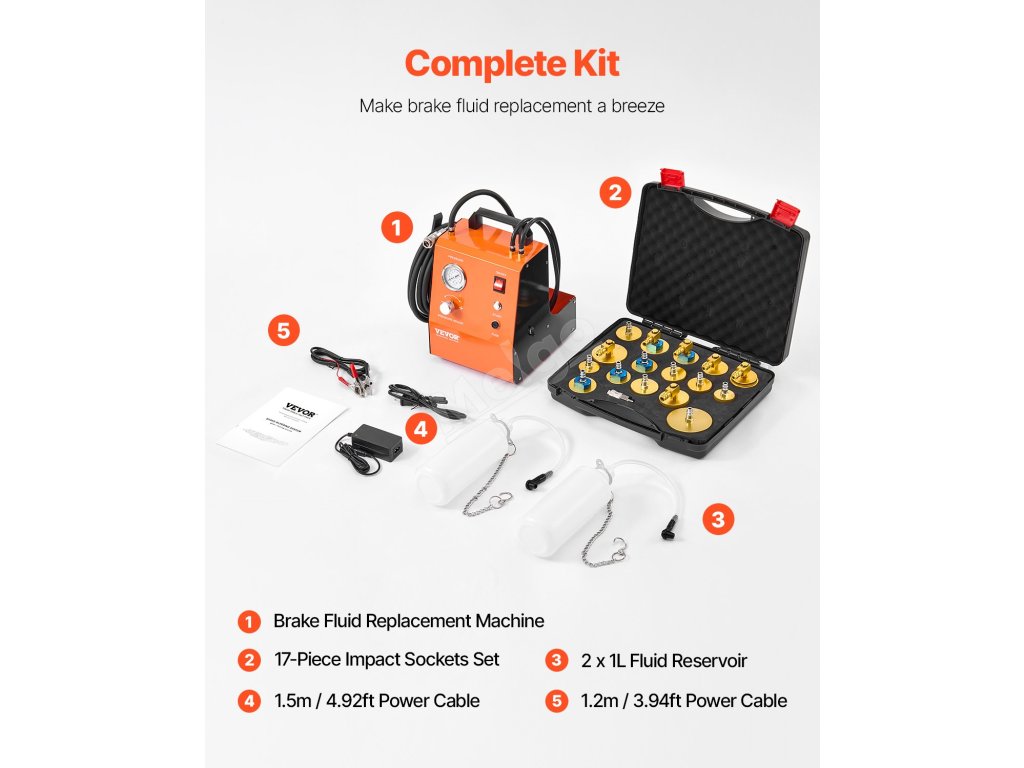 Tato sada obsahuje 1 hlavní jednotku, 2 x 1l nádrž, 17 adaptérů a 2 napájecí kabely. Díky vzduchové pumpě a nastavitelnému tlaku (0,6-3,0 bar) je kompatibilní s různými vozidly. Podporuje napájení 12 V a 110 V/220 V pro snadnou výměnu brzdové kapaliny kdekoli. Nepostradatelný nástroj pro opravy automobilů.