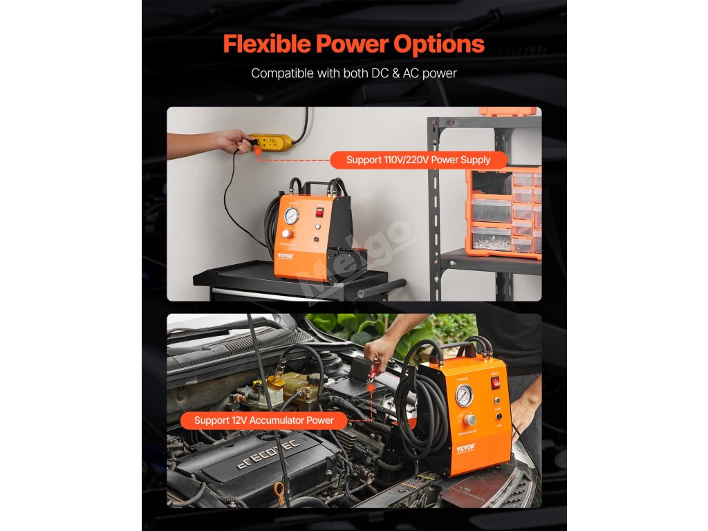 Sada pro elektrickou výměnu brzdové kapaliny je navržena tak, aby podporovala napájení z 12V baterie i ze 110V/220V, takže je univerzální pro použití v různých prostředích. Ať už pracujete v interiéru nebo venku, můžete snadno přepínat mezi možnostmi napájení.