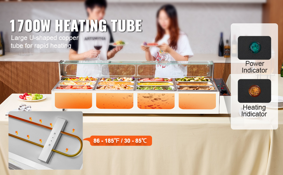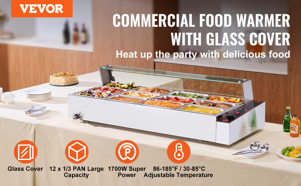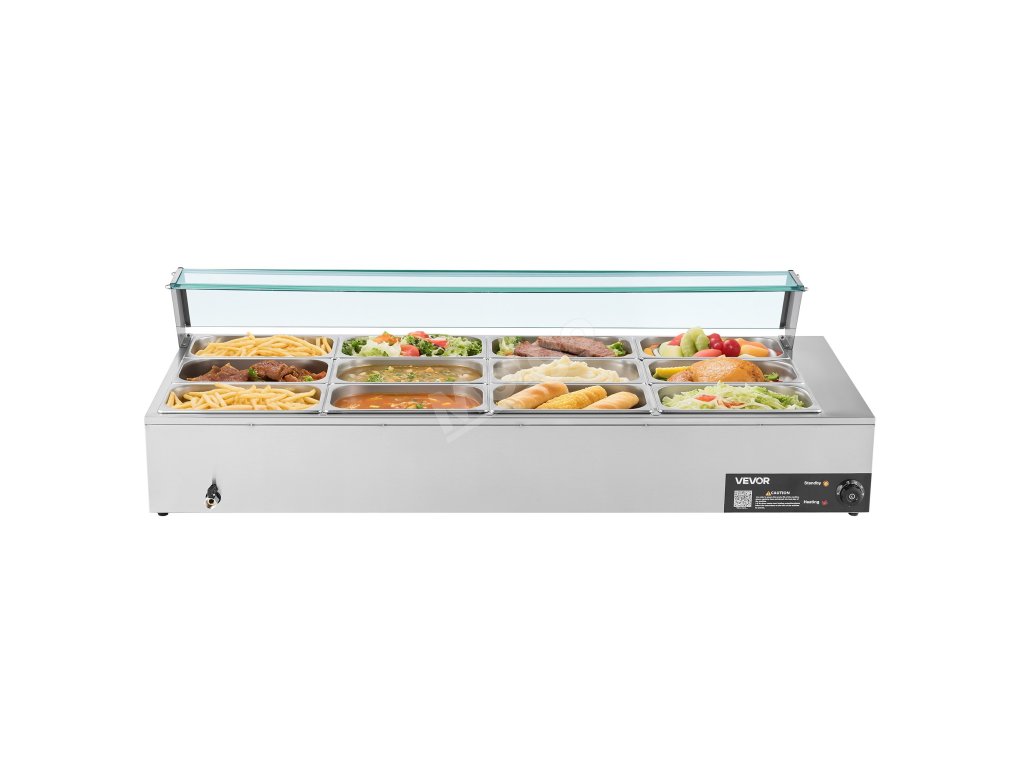 Tento 12plotýnkový ohřívač potravin z nerezové oceli se skleněným krytem je vybaven systémem suchého spalování a tlačítkem reset pro ochranu před poškozením. Teplotní rozsah 86 - 185℉ / 30 - 85 ℃ umožňuje zvolit ideální nastavení, aby bylo jídlo kdykoli horké a připravené k servírování.