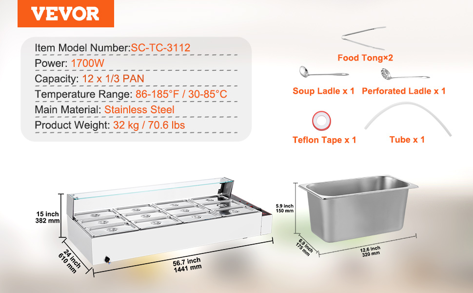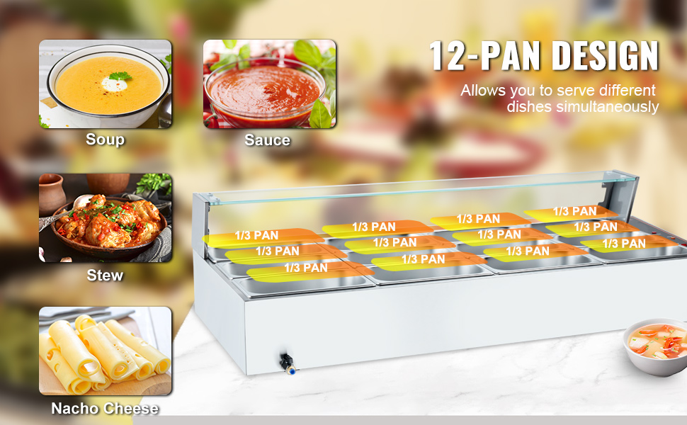 Náš komerční ohřívač potravin se dodává s 12 nádobami o objemu 5 qt a odpovídajícími víky, což vám umožní ohřívat více potravin najednou. Udržujte své chutné jídlo trvale teplé po delší dobu, což je ideální pro vytížené komerční kuchyně.
